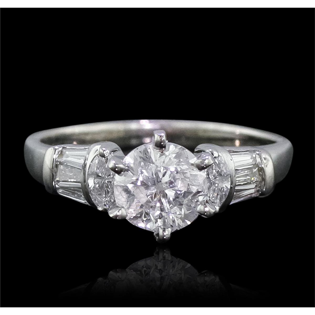 One electronically tested 14KT white gold Ladies combination cast & assembled engagement ring with a bright polish finish. Condition is very good. Containing: One prong set round brilliant cut diamond, measuring 6.40 - 6.40 x 4.21mm (depth est.) approximate weight of 1.05ct. Clarity: I-3. Color: J, Cut is Good. Six prong set baguette cut diamonds, measuring 2.80 x 1.50 x 1.28mm (depth est.) approximate. Total Weight of 6 Stones = 0.30ct. Clarity: SI-2 to I-2. Color: I - J, Cut is Good. Two prong set marquise shaped cut diamonds, measuring 4.00 x 2.50 x 1.58mm (depth est.) approximate. Total Weight of 2 Stones = 0.18ct. Clarity: SI-2. Color: H - I, Cut is Good. Diamonds graded in the mounting. Total Weight of Diamonds 1.53ct. Total Weight of Ring 3.10 grams. GGL Appraised at $7,560.00.