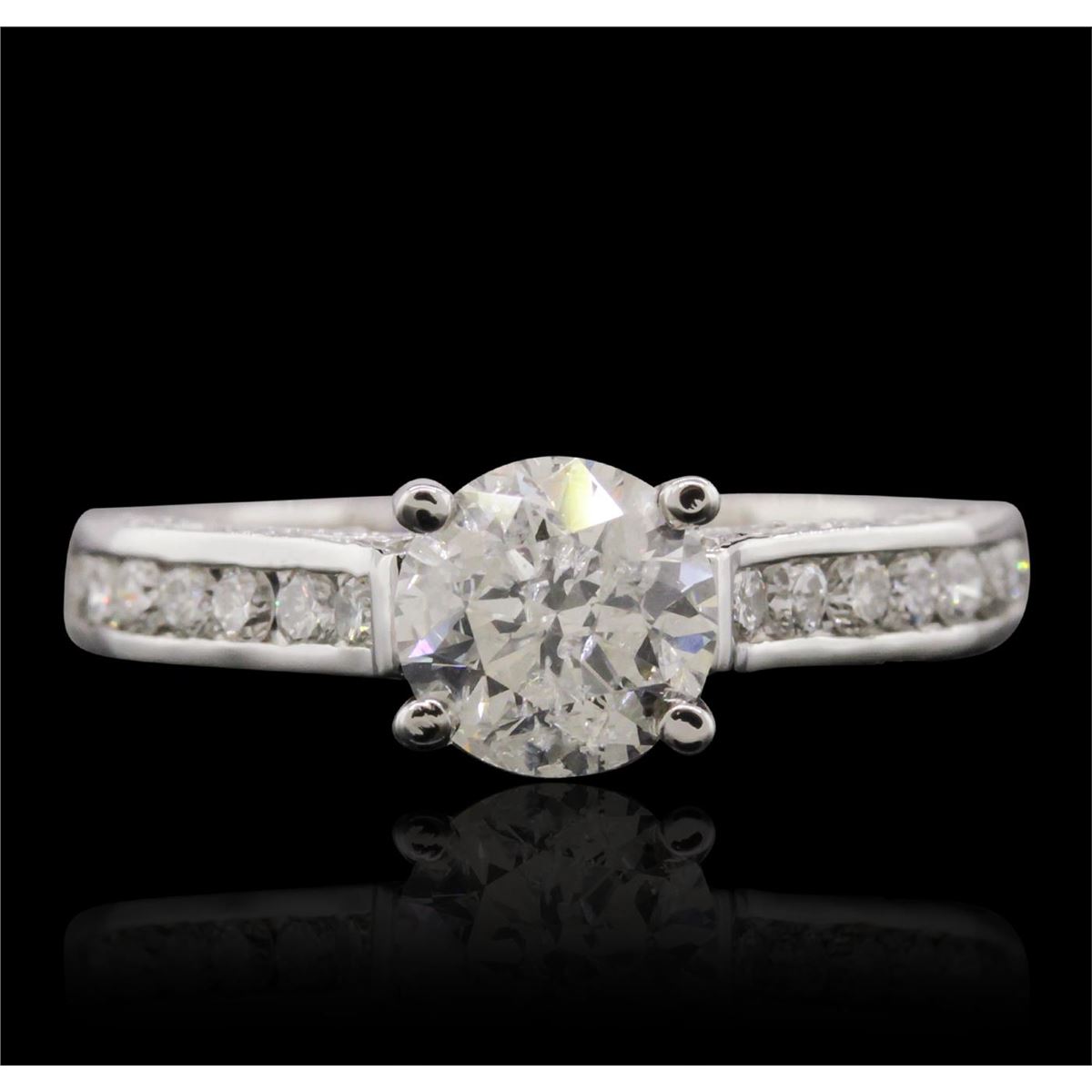 One electronically tested 14KT white gold Ladies combination cast & assembled engagement ring with a bright polish finish. Condition is new. Identified with markings of "14K". Containing: One prong set round brilliant cut diamond, measuring 6.53 - 6.51 x 4.17mm (depth est.) approximate weight of 1.10ct. Clarity: I-1. Color: G, Cut is Good. Twenty-Nine prong set round brilliant cut diamonds, measuring 1.60 - 1.60 x 0.96mm (depth est.) approximate. Total Weight of 29 Stones = 0.43ct. Clarity: SI-1 to SI-2. Color: F - G, Cut is Good. EGL USA GEM ID# US 911348411D. All diamonds are graded in the mounting, unless otherwise stated. Total Weight of Diamonds 1.53ct. Total Weight of Engagement Ring 3.20 grams. GGL Appraised at $20,635.00.