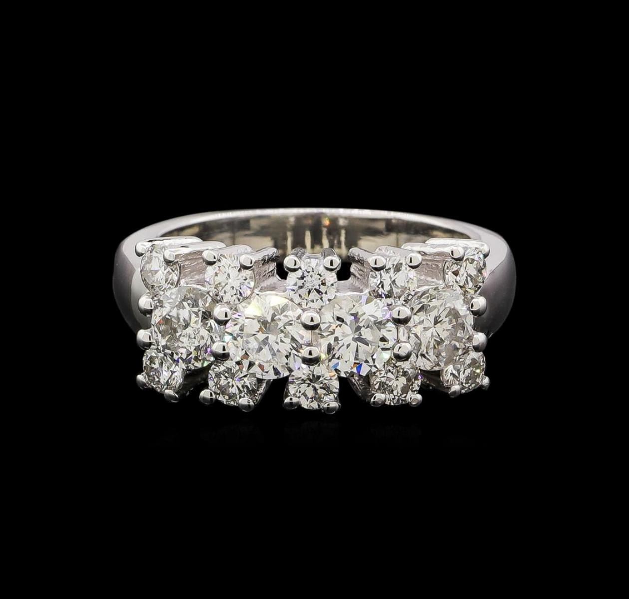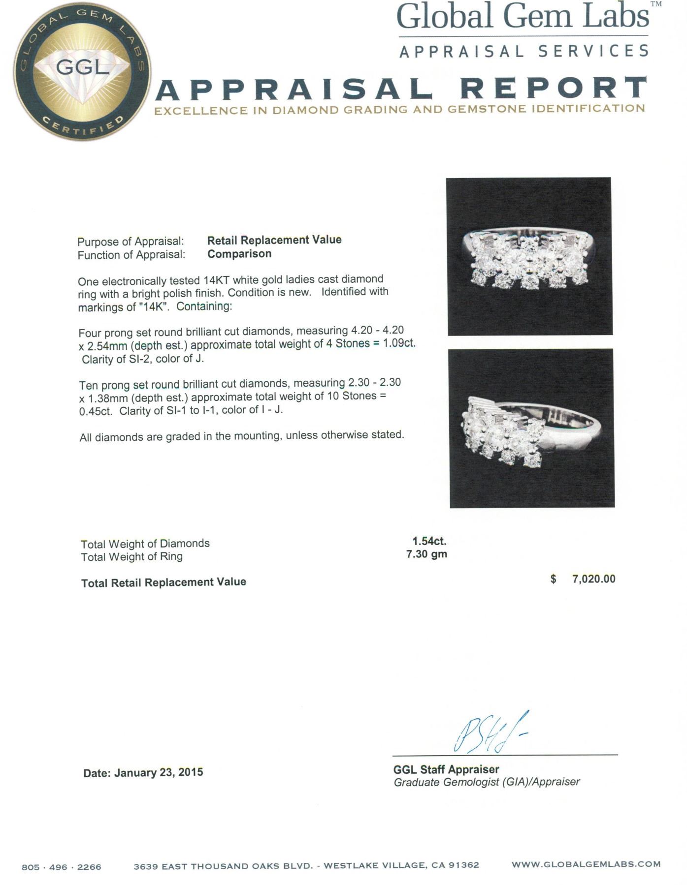 One electronically tested 14KT white gold ladies cast diamond ring with a bright polish finish. Identified with markings of "14K". Condition is new. Containing: Four prong set round brilliant cut diamonds, measuring 4.20 - 4.20 x 2.54mm (depth est.) approximate total weight of 4 Stones = 1.09ct. Clarity: SI-2. Color: J. Ten prong set round brilliant cut diamonds, measuring 2.30 - 2.30 x 1.38mm (depth est.) approximate total weight of 10 Stones = 0.45ct. Clarity: SI-1 to I-1. Color: I - J. All diamonds are graded in the mounting, unless otherwise stated. Total Weight of Diamonds 1.54ct. Total Weight of Ring 7.30 grams. GGL Appraised at $7,020.00.