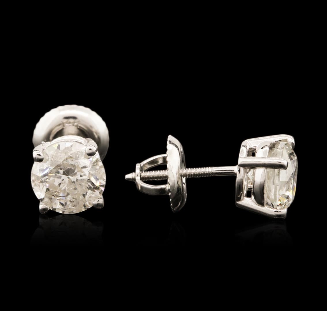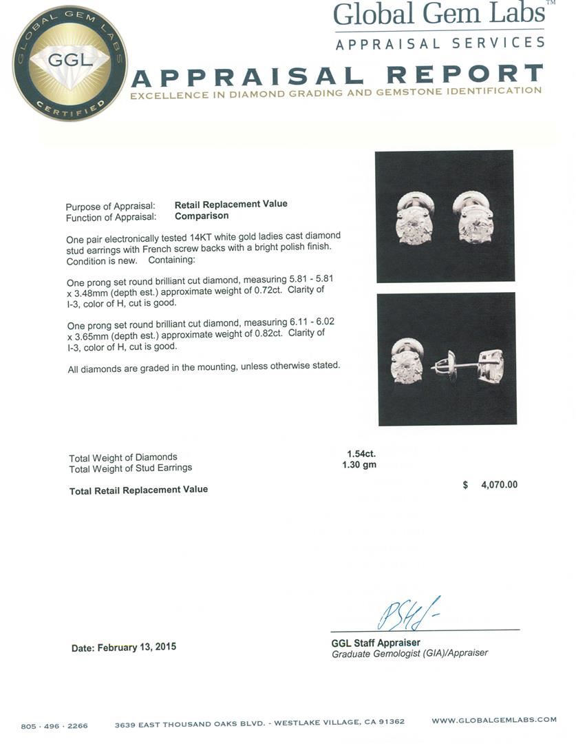 One pair electronically tested 14KT white gold ladies cast diamond stud earrings with French screw backs with a bright polish finish. Condition is new. Containing: One prong set round brilliant cut diamond, measuring 5.81 - 5.81 x 3.48mm (depth est.) approximate weight of 0.72ct. Clarity: I-3. Color: H, Cut is Good. One prong set round brilliant cut diamond, measuring 6.11 - 6.02 x 3.65mm (depth est.) approximate weight of 0.82ct. Clarity: I-3. Color: H, Cut is Good. All diamonds are graded in the mounting, unless otherwise stated. Total Weight of Diamonds 1.54ct. Total Weight of Stud Earrings 1.30 grams. GGL Appraised at $4,070.00.