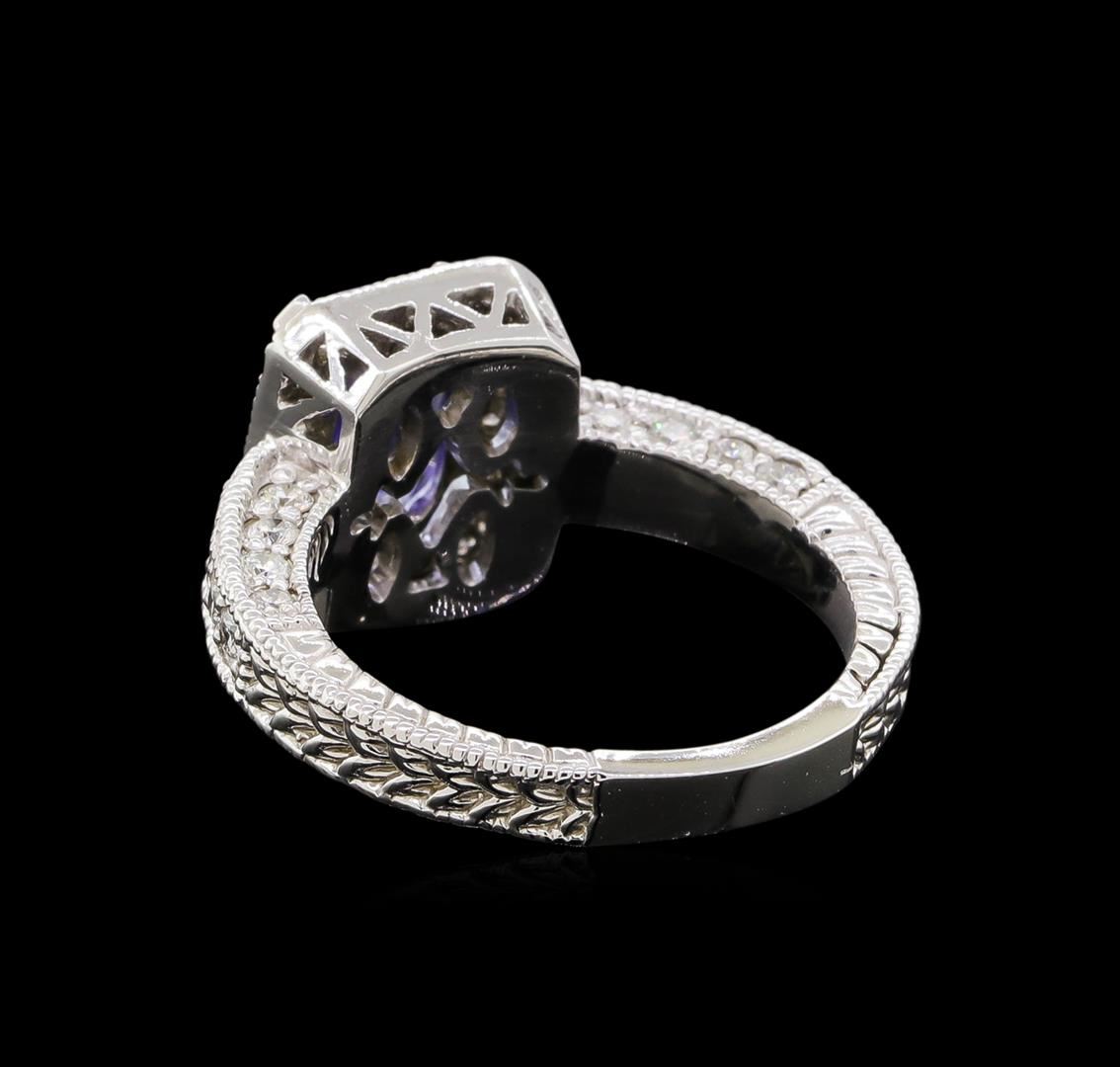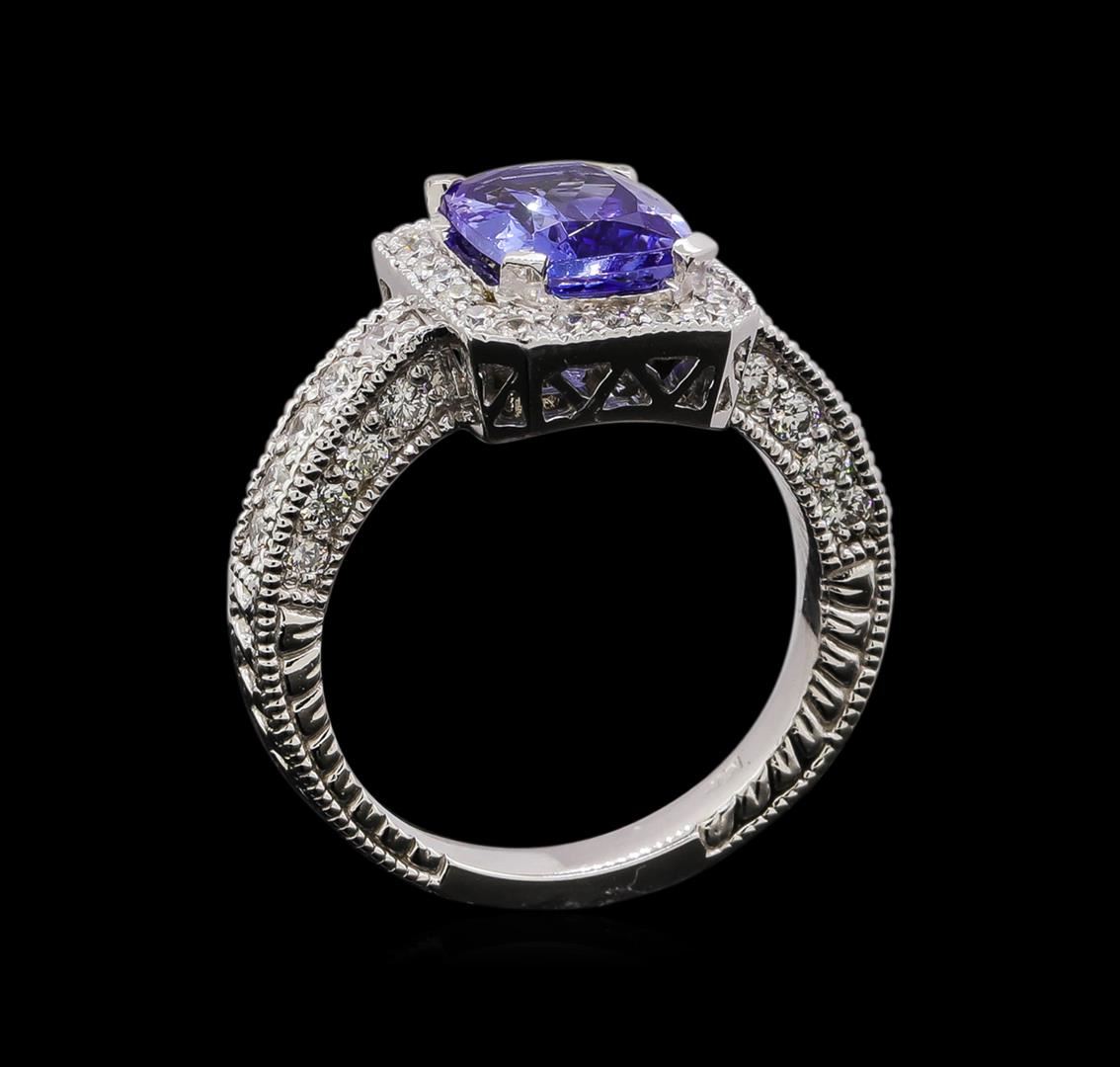One electronically tested 14KT white gold ladies combination cast & assembled tanzanite and diamond ring with a bright polish finish. Identified with markings of "14K". Condition is new. Containing: One prong set rectangular cushion modified brilliant cut natural tanzanite, measuring 8.80 x 6.80 x 3.26mm, approximate weight of 1.54ct., clarity is eye clean, type I, medium light, slightly grayish, violet color, (GIA V 4/2), cut is good. Thirty prong set round brilliant cut diamonds, measuring 1.60 - 1.30 x 0.87mm (depth est.) approximate total weight of 30 Stones = 0.33ct. Clarity: SI-1 to SI-2. Color: I - J, Cut is Good. Colored gemstones are presumed to have been subjected to commonly used enhancement processes. All diamonds and colored gemstones are graded in the mounting, unless otherwise stated. Total Weight of Colored Stones 1.54ct. Total Weight of Diamonds 0.33ct. Total Weight of Ring 6.50 grams. GGL Appraised at $4,245.00.