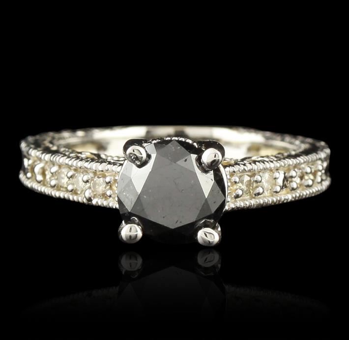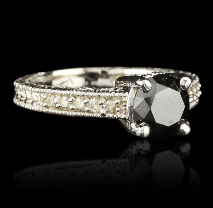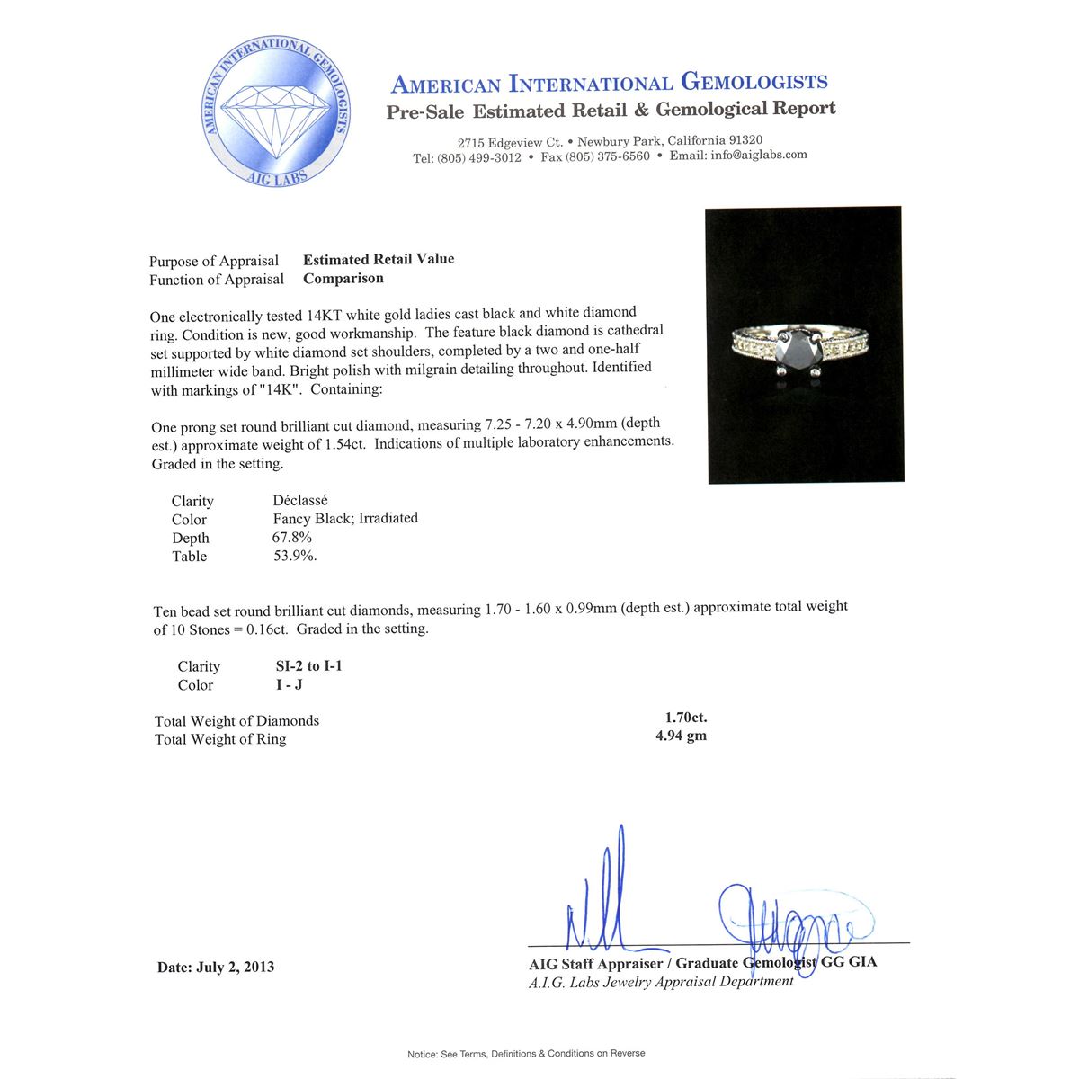 One electronically tested 14KT white gold ladies cast black and white diamond ring. Condition is new, good workmanship. The feature black diamond is cathedral set supported by white diamond set shoulder, completed by a two and one-half millimeter wide band. Bright polish finish with milgrain detailing throughout. Identified with markings of "14K". Containing: One prong set round brilliant cut diamond, measuring 7.25 - 7.20 x 4.90mm (depth est.) approximate weight of 1.54ct. Indications of multiple laboratory enhancements. Graded in the setting. Clarity Déclassé. Color Fancy Black; Irradiated. Depth 67.8%. Table 53.9%. Ten bead set round brilliant cut diamonds, measuring 1.70 - 1.60 x 0.99mm(depth est.) approximate total weight of 10 Stones = 0.16ct. Graded in the setting. Clarity SI-2 to I-1. Color I - J. Total Weight of Diamonds 1.70ct. Total Weight of Ring 4.94gm. . AIG Appraised at $2,520.00.