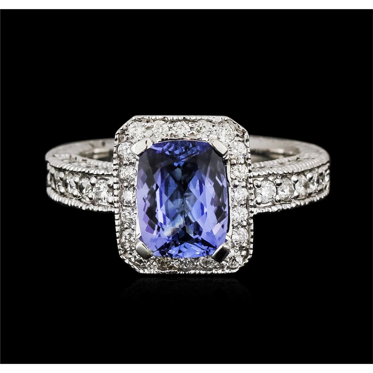 One electronically tested 14KT white gold ladies combination cast & assembled tanzanite and diamond ring with a bright polish finish. Identified with markings of "14K". Condition is new. Containing: One prong set rectangular cushion modified brilliant cut natural tanzanite, measuring 8.80 x 6.80 x 3.26mm, approximate weight of 1.54ct., clarity is eye clean, type I, medium light, slightly grayish, violet color, (GIA V 4/2), cut is good. Thirty prong set round brilliant cut diamonds, measuring 1.60 - 1.30 x 0.87mm (depth est.) approximate total weight of 30 Stones = 0.33ct. Clarity: SI-1 to SI-2. Color: I - J, Cut is Good. Colored gemstones are presumed to have been subjected to commonly used enhancement processes. All diamonds and colored gemstones are graded in the mounting, unless otherwise stated. Total Weight of Colored Stones 1.54ct. Total Weight of Diamonds 0.33ct. Total Weight of Ring 6.50 grams. GGL Appraised at $4,245.00.