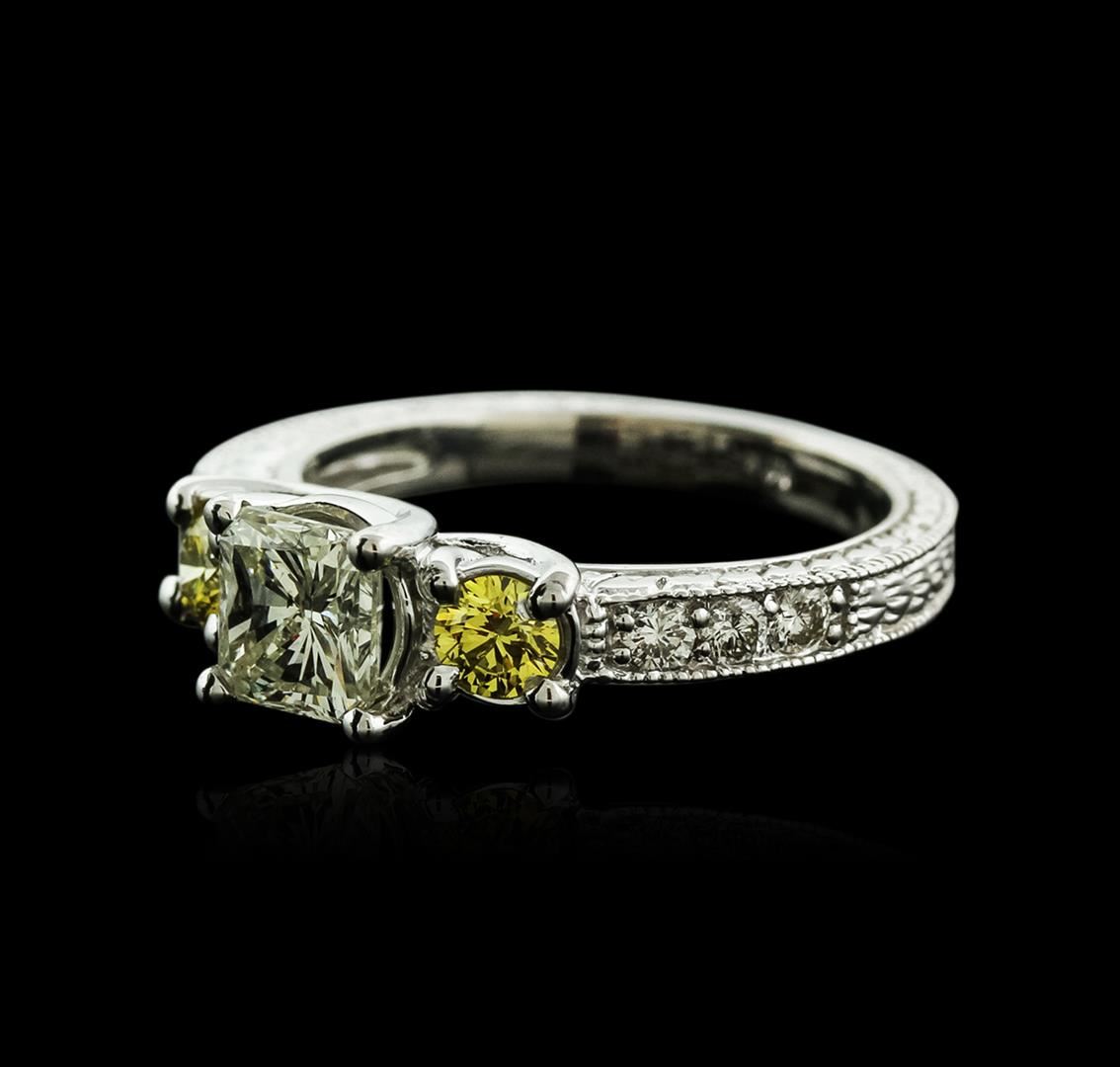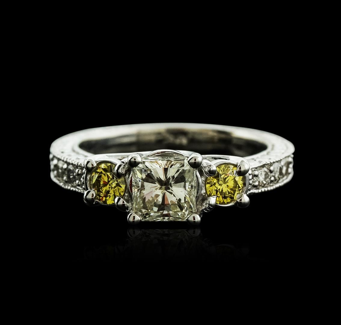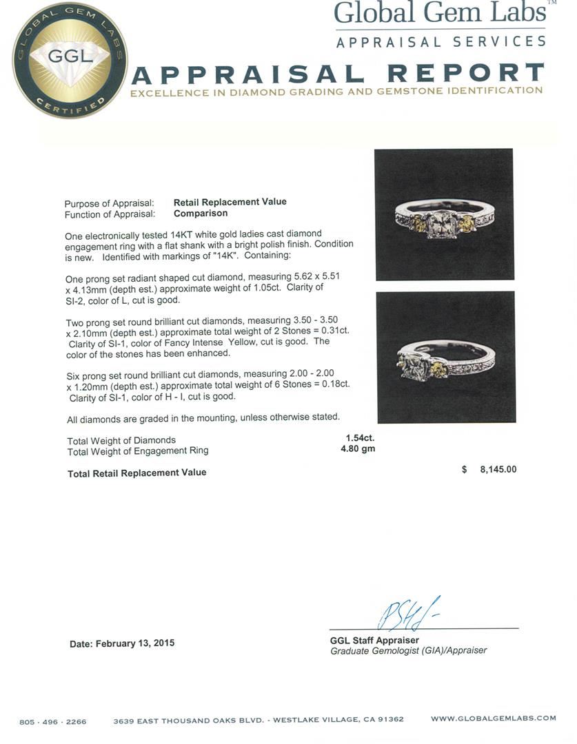 One electronically tested 14KT white gold ladies cast diamond engagement ring with a flat shank with a bright polish finish. Identified with markings of "14K". Condition is new. Containing: One prong set radiant shaped cut diamond, measuring 5.62 x 5.51 x 4.13mm (depth est.) approximate weight of 1.05ct. Clarity: SI-2. Color: L, Cut is Good. Two prong set round brilliant cut diamonds, measuring 3.50 - 3.50 x 2.10mm (depth est.) approximate total weight of 2 Stones = 0.31ct. Clarity: SI-1, Cut is Good. The color of the stones has been enhanced. Six prong set round brilliant cut diamonds, measuring 2.00 - 2.00 x 1.20mm (depth est.) approximate total weight of 6 Stones = 0.18ct. Clarity: SI-1. Color: H - I, Cut is Good. All diamonds are graded in the mounting, unless otherwise stated. Total Weight of Diamonds 1.54ct. Total Weight of Engagement Ring 4.80 grams. GGL Appraised at $8,145.00.