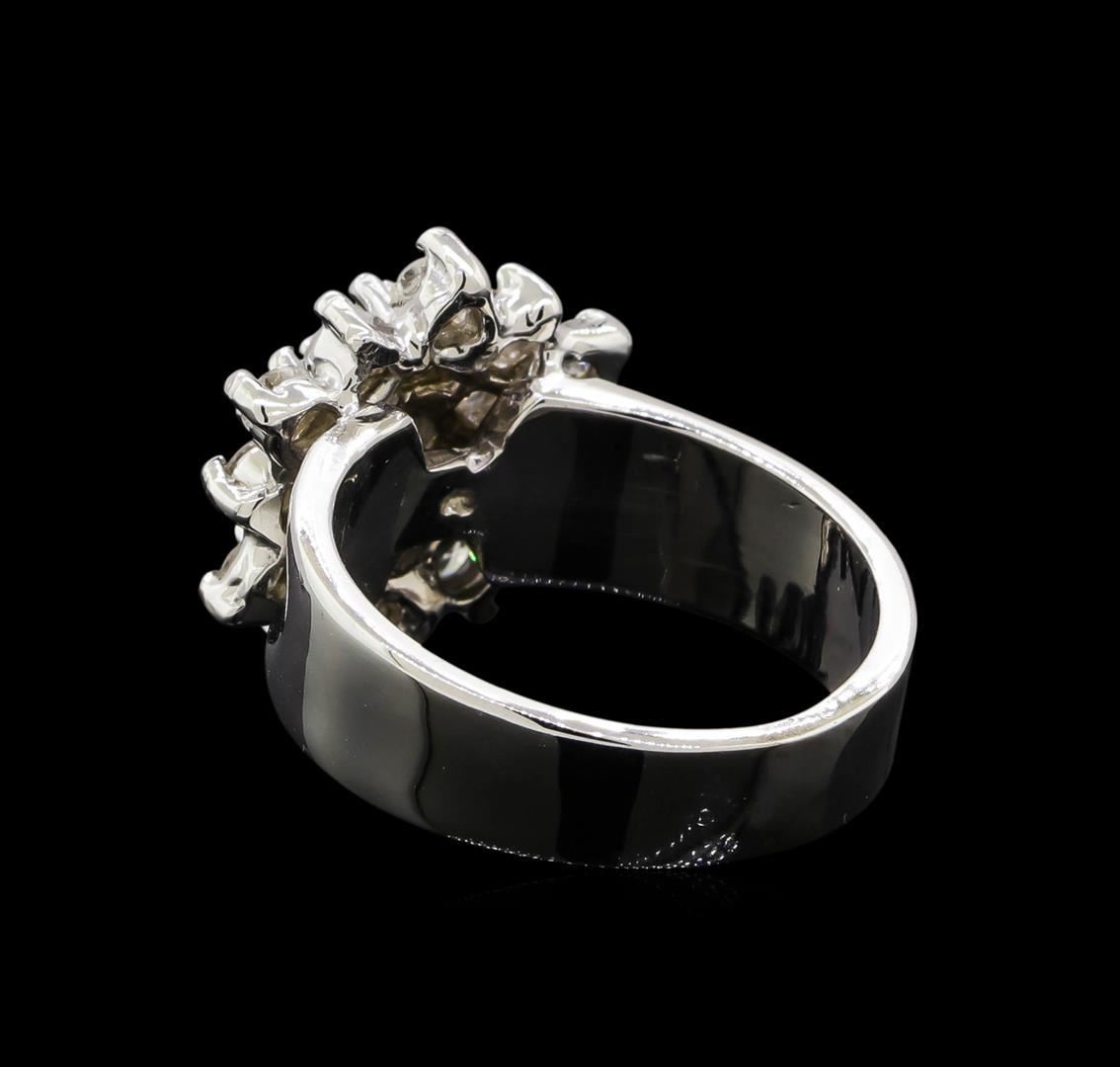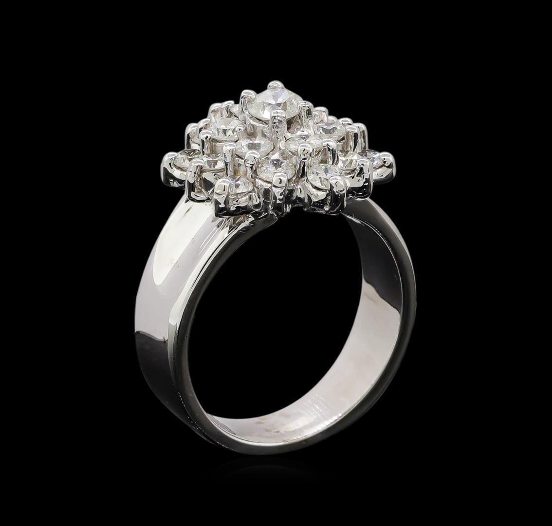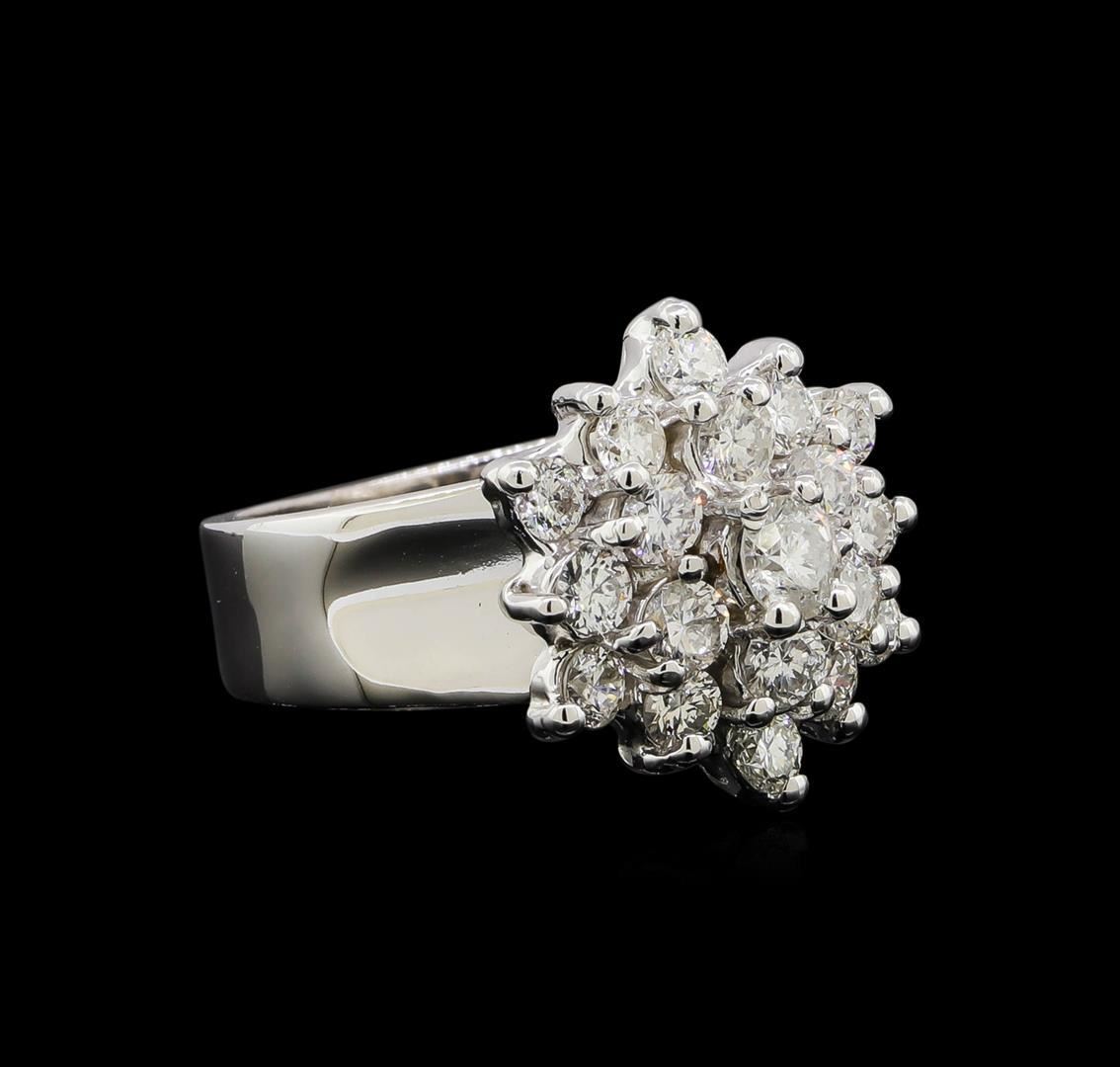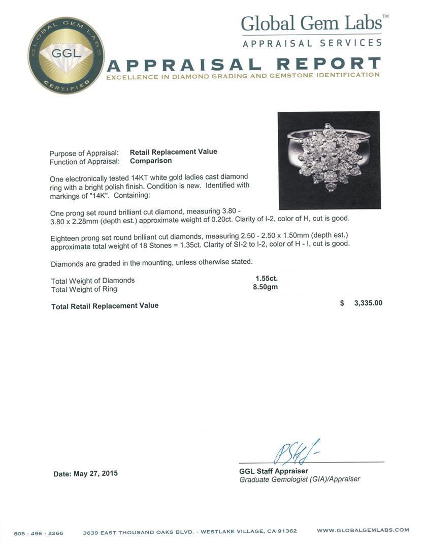 One electronically tested 14KT white gold ladies cast diamond ring with a bright polish finish. Identified with markings of "14K". Condition is new. Containing: One prong set round brilliant cut diamond, measuring 3.80 - 3.80 x 2.28mm (depth est.) approximate weight of 0.20 ct. Clarity: I-2. Color: H, Cut is Good. Eighteen prong set round brilliant cut diamonds, measuring 2.50 - 2.50 x 1.50mm (depth est.) approximate total weight of 18 Stones = 1.35ct. Clarity: SI-2 to I-2. Color: H - I, Cut is Good. Diamonds are graded in the mounting, unless otherwise stated. Total Weight of Diamonds 1.55ct. Total Weight of Ring 8.50 grams. GGL Appraised.