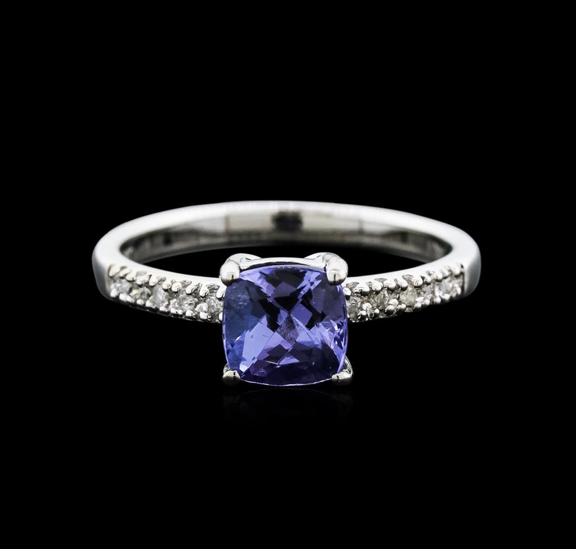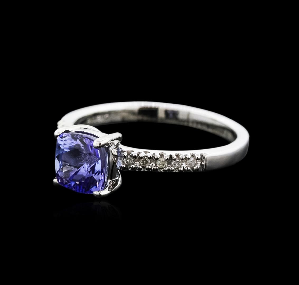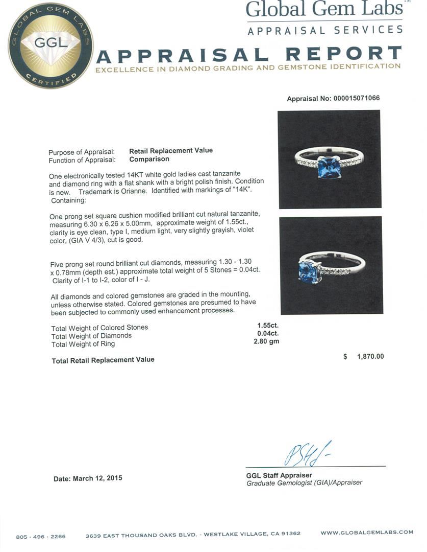 One electronically tested 14KT white gold ladies cast tanzanite and diamond ring with a flat shank with a bright polish finish. Trademark is Orianne. Identified with markings of "14K". Condition is new. Containing: One prong set square cushion modified brilliant cut natural tanzanite, measuring 6.30 x 6.26 x 5.00mm, approximate weight of 1.55ct., clarity is eye clean, type I, medium light, very slightly grayish, violet color, (GIA V 4/3), cut is good. Five prong set round brilliant cut diamonds, measuring 1.30 - 1.30 x 0.78mm (depth est.) approximate total weight of 5 Stones = 0.04ct. Clarity: I-1 to I-2. Color: I - J. All diamonds and colored gemstones are graded in the mounting, unless otherwise stated. Colored gemstones are presumed to have been subjected to commonly used enhancement processes. Total Weight of Colored Stones 1.55ct. Total Weight of Diamonds 0.04ct. Total Weight of Ring 2.80 grams. GGL Appraised at $1,870.00.