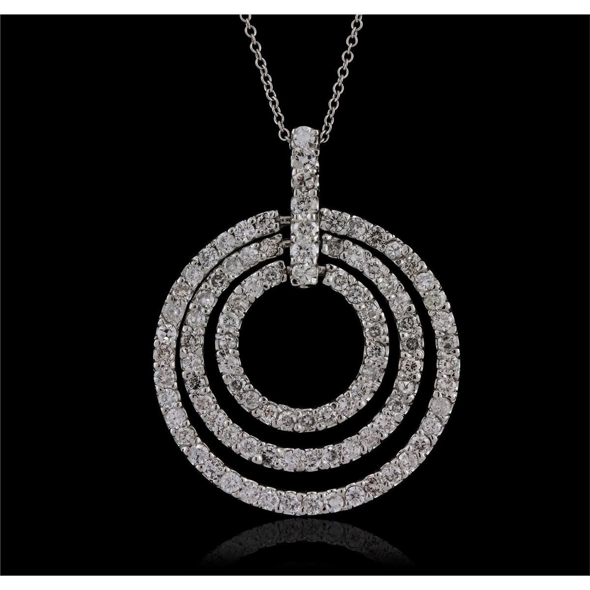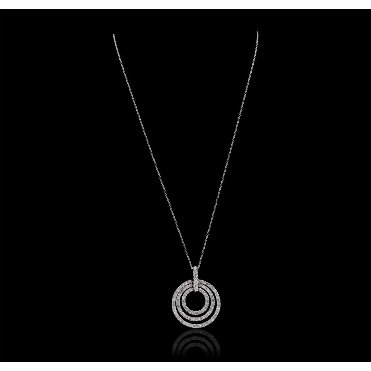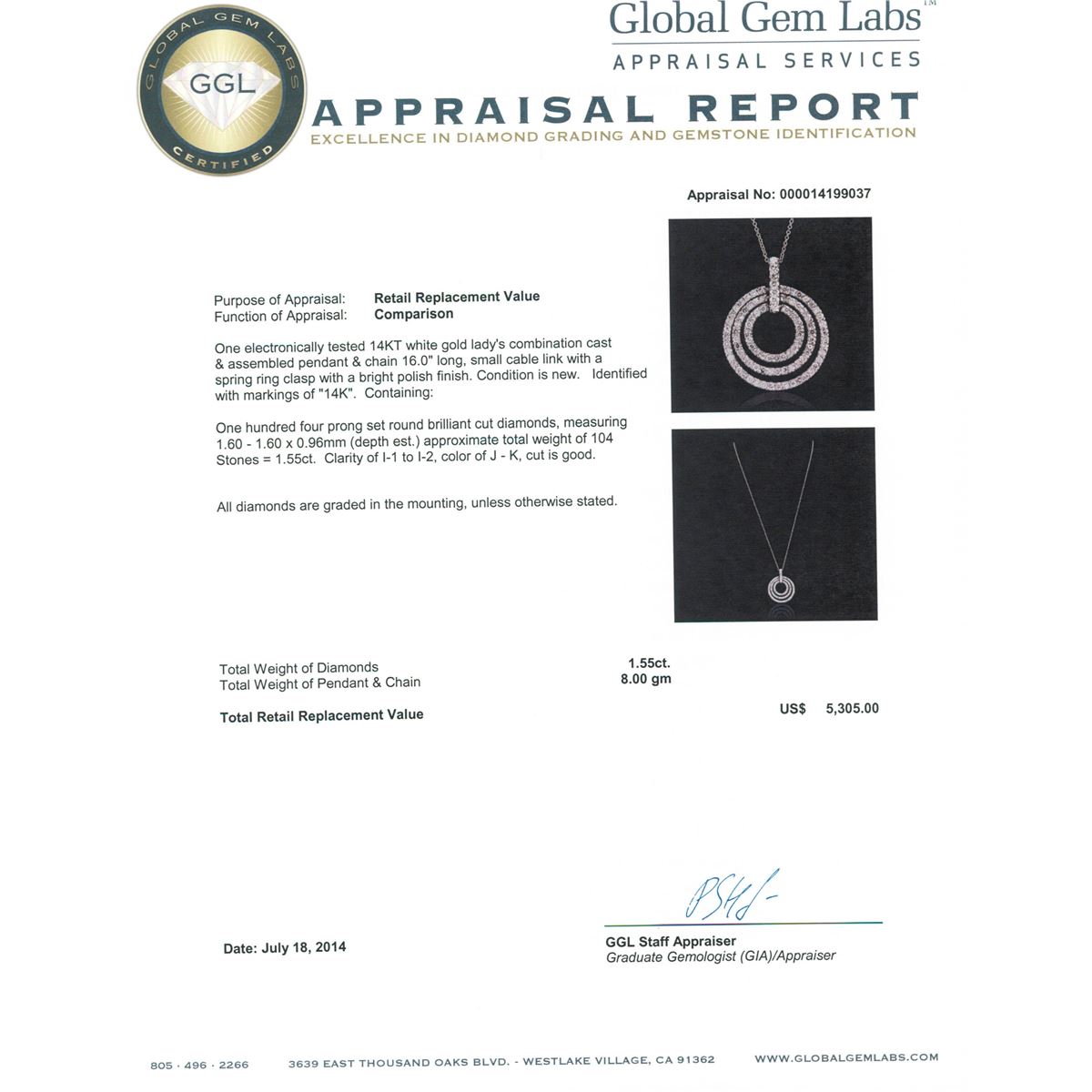 One electronically tested 14KT white gold Ladies combination cast & assembled pendant & chain 16.0" long, small cable link with a spring ring clasp with a bright polish finish. Condition is new. Identified with markings of "14K". Containing: One Hundred Four prong set round brilliant cut diamonds, measuring 1.60 - 1.60 x 0.96mm (depth est.) approximate. Total Weight of 104 Stones = 1.55ct. Clarity: I-1 to I-2. Color: J - K, Cut is Good. All diamonds are graded in the mounting, unless otherwise stated. Total Weight of Diamonds 1.55ct. Total Weight of Pendant & Chain 8.00 grams.. GGL Appraised at $5,305.00.