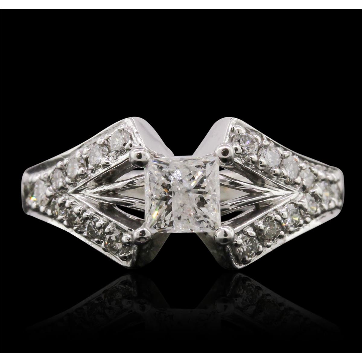 One electronically tested 14KT white gold ladies cast & assembled diamond unity ring. Condition is new, good workmanship. The featured diamond is supported by elaborate diamond set shoulders, completed by a two and one-half millimeter wide band Bright polish finish with milgrain detailing. Identified with markings of "14K". Containing: One prong set princess cut diamond, measuring 4.75 x 4.70 x 4.20mm (depth est.), 5.00.%. GTCF approximate weight of 0.90ct. Graded in the setting. Clarity: I-1. Color: I Depth 89.4%. Table 78.7%. Twenty bead set round brilliant cut diamonds, measuring 2.00 - 1.90 x 1.17mm (depth est.) approximate. Total Weight of 20 Stones = 0.65ct. Graded in the setting. Clarity: SI-1 to SI-2. Color: G - I. Total Weight of Diamonds 1.55ct. Total Weight of Ring 6.85 grams. AIG Appraised at $11,230.00.