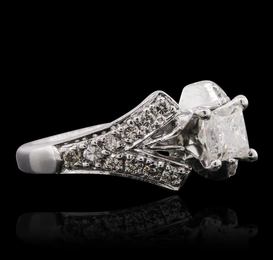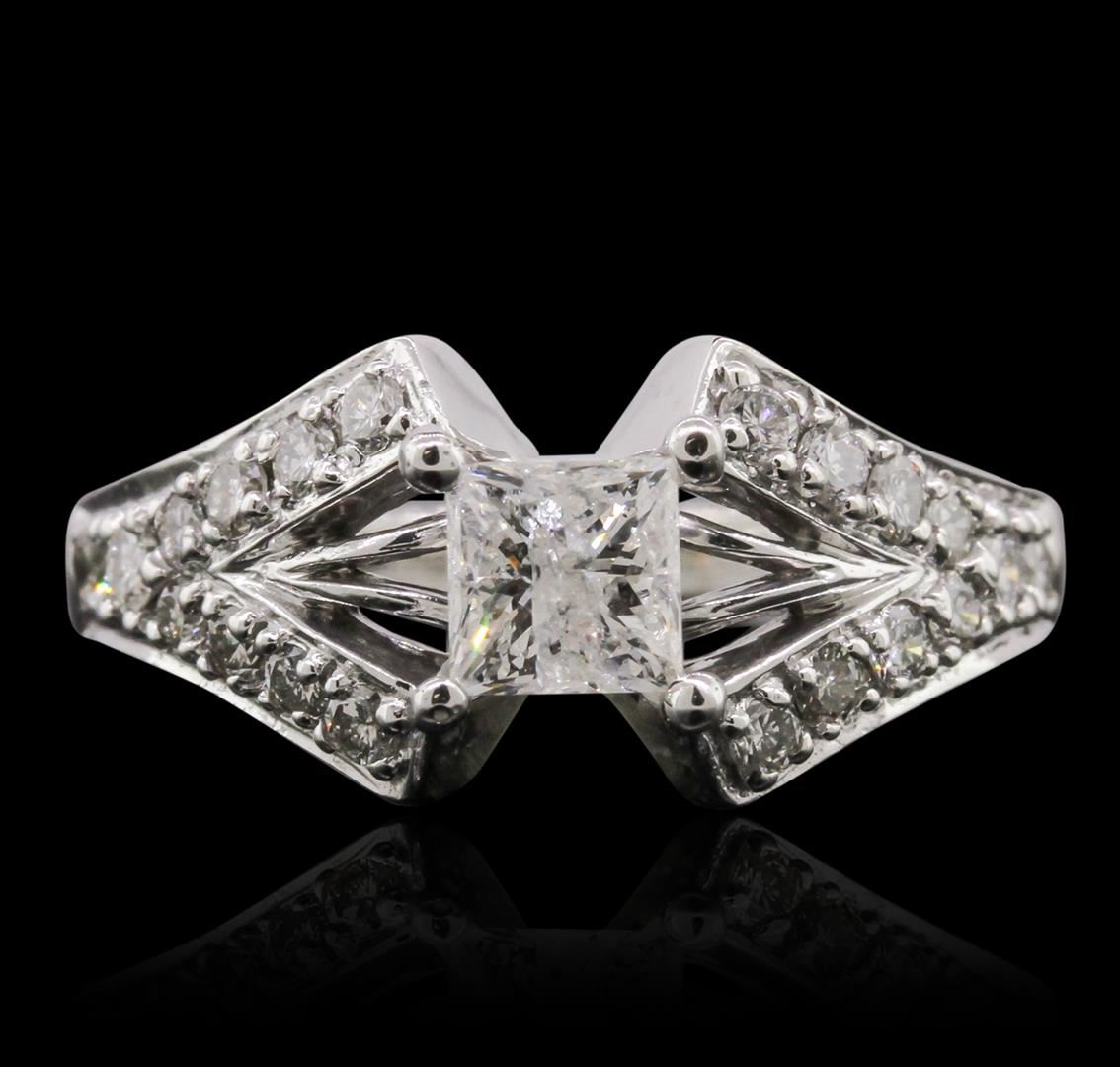 One electronically tested 14KT white gold ladies cast & assembled diamond unity ring. Condition is new, good workmanship. The featured diamond is supported by elaborate diamond set shoulders, completed by a two and one-half millimeter wide band Bright polish finish with milgrain detailing. Identified with markings of "14K". Containing: One prong set princess cut diamond, measuring 4.75 x 4.70 x 4.20mm (depth est.), 5.00.%. GTCF approximate weight of 0.90ct. Graded in the setting. Clarity: I-1. Color: I Depth 89.4%. Table 78.7%. Twenty bead set round brilliant cut diamonds, measuring 2.00 - 1.90 x 1.17mm (depth est.) approximate. Total Weight of 20 Stones = 0.65ct. Graded in the setting. Clarity: SI-1 to SI-2. Color: G - I. Total Weight of Diamonds 1.55ct. Total Weight of Ring 6.85 grams. AIG Appraised at $11,230.00.