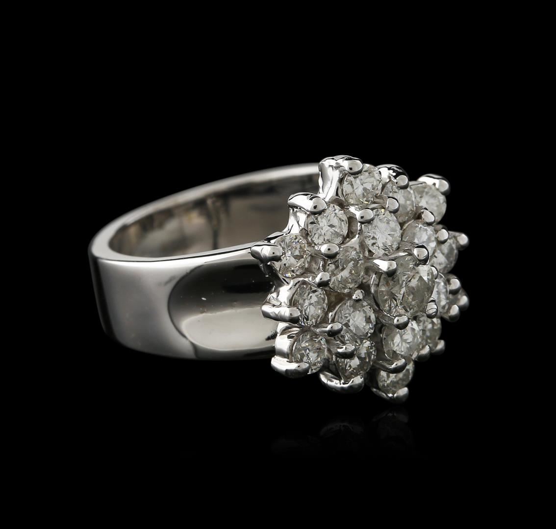 One electronically tested 14KT white gold ladies cast diamond ring with a bright polish finish. Identified with markings of "14K". Condition is new. Containing: One prong set round brilliant cut diamond, measuring 3.80 - 3.80 x 2.28mm (depth est.) approximate weight of 0.20ct. Clarity: I-2. Color: H, Cut is Good. Eighteen prong set round brilliant cut diamonds, measuring 2.50 - 2.50 x 1.50mm (depth est.) approximate total weight of 18 Stones = 1.35ct. Clarity: SI-2 to I-2. Color: H - I, Cut is Good. Diamonds are graded in the mounting, unless otherwise stated. Total Weight of Diamonds 1.55ct. Total Weight of Ring 8.50 grams. GGL Appraised at $3,335.00.