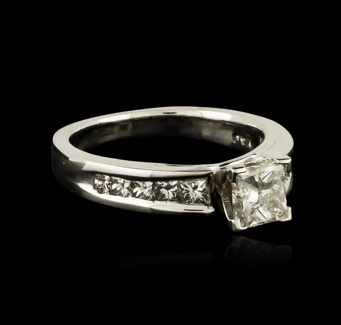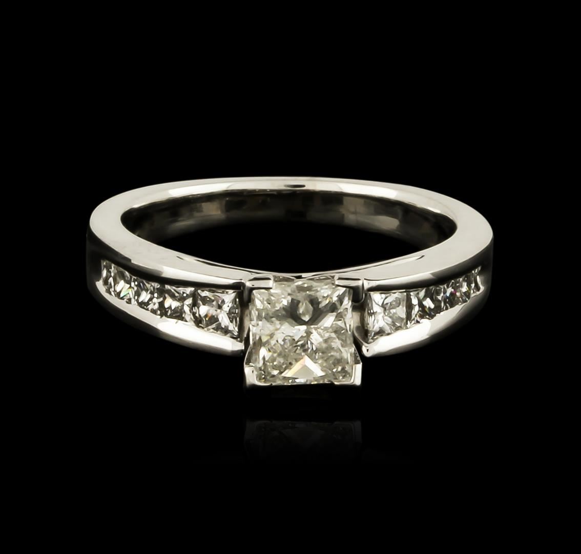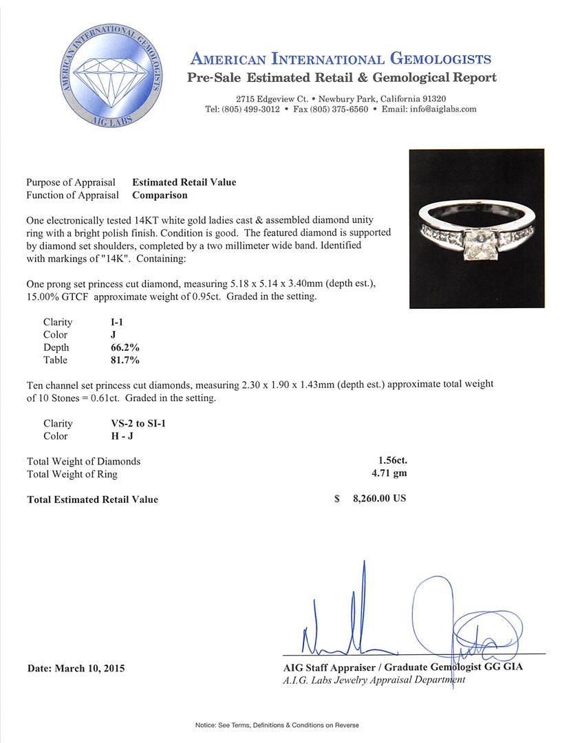 One electronically tested 14KT white gold ladies cast & assembled diamond unity ring with a bright polish finish. The featured diamond is supported by diamond set shoulders, completed by a two millimeter wide band. Identified with markings of "14K". Condition is good. Containing: One prong set princess cut diamond, measuring 5.18 x 5.14 x 3.40mm (depth est.), 15.00.%. GTCF approximate weight of 0.95ct. Graded in the setting. Clarity: I-1. Color: J. Depth 66.2%. Table 81.7%. Ten channel set princess cut diamonds, measuring 2.30 x 1.90 x 1.43mm (depth est.) approximate total weight of 10 Stones = 0.61ct. Graded in the setting. Clarity: VS-2 to SI-1. Color: H - J. Total Weight of Diamonds 1.56ct. Total Weight of Ring 4.71 grams. AIG Appraised at $8,260.00.
