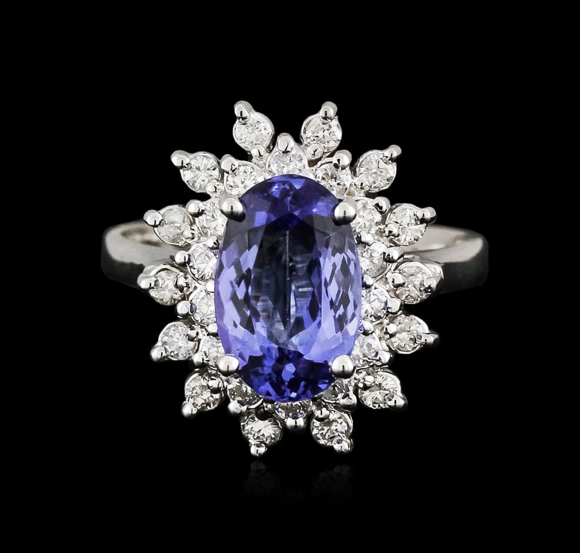 One electronically tested 14KT white gold ladies combination cast & assembled tanzanite and diamond ring with a bright polish finish. Identified with markings of "14K". Condition is new. Containing: One prong set oval modified brilliant cut natural tanzanite, measuring 10.30 x 6.70 x 3.21mm, approximate weight of 1.56ct., clarity is eye clean, type I, medium light, very slightly grayish, bluish violet color, (GIA bV 4/3), cut is good. Twenty-Eight prong set round brilliant cut diamonds, measuring 1.60 - 1.50 x 0.93mm (depth est.) approximate total weight of 28 Stones = 0.38ct. Clarity: SI-2 to I-1. Color: I - J, Cut is Good. Colored gemstones are presumed to have been subjected to commonly used enhancement processes. All diamonds and colored gemstones are graded in the mounting, unless otherwise stated. Total Weight of Colored Stones 1.56ct. Total Weight of Diamonds 0.38ct. Total Weight of Ring 5.40 grams. GGL Appraised at $3,880.00.
