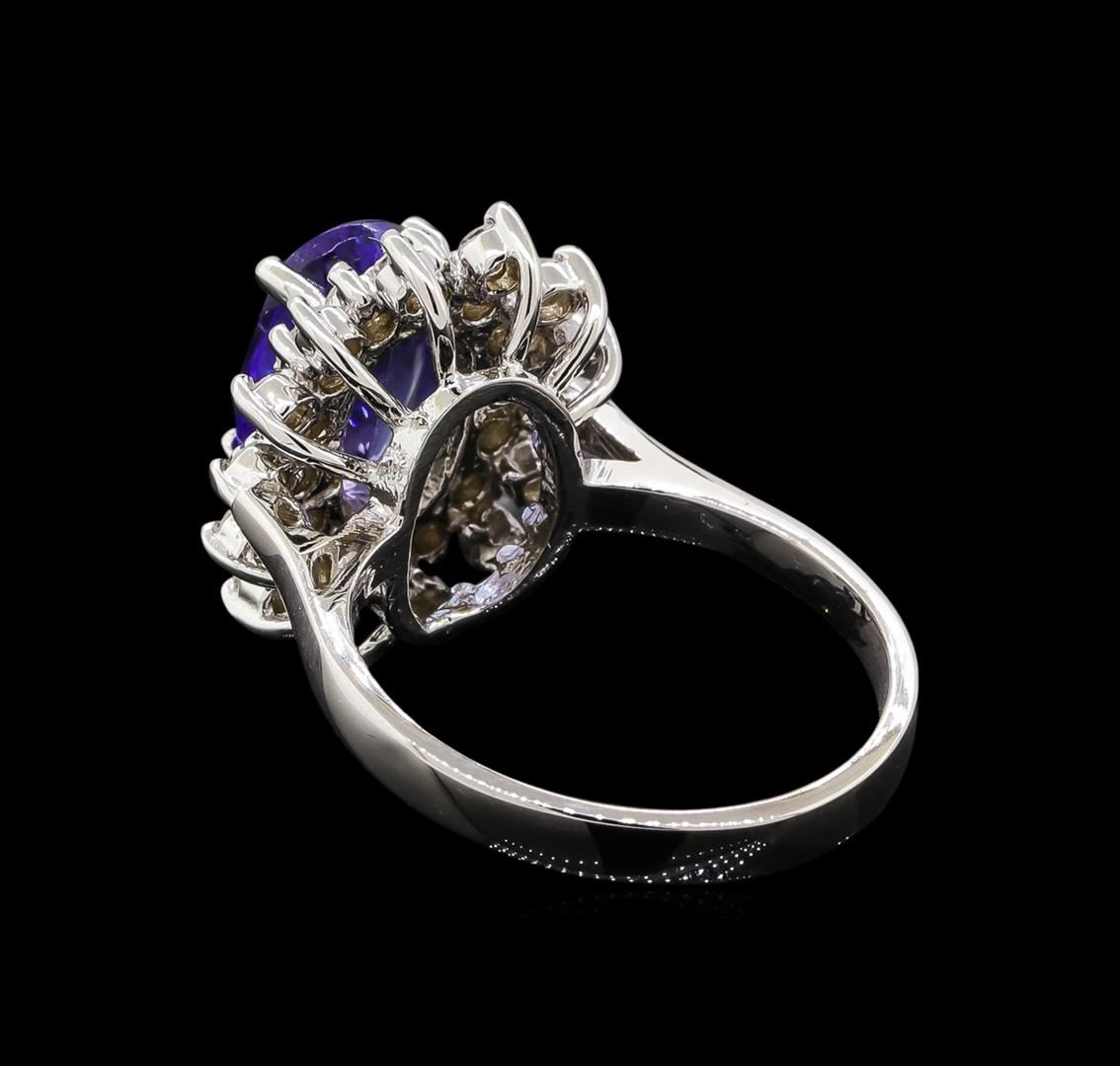 One electronically tested 14KT white gold ladies combination cast & assembled tanzanite and diamond ring with a bright polish finish. Identified with markings of "14K". Condition is new. Containing: One prong set oval modified brilliant cut natural tanzanite, measuring 10.30 x 6.70 x 3.21mm, approximate weight of 1.56ct., clarity is eye clean, type I, medium light, very slightly grayish, bluish violet color, (GIA bV 4/3), cut is good. Twenty-Eight prong set round brilliant cut diamonds, measuring 1.60 - 1.50 x 0.93mm (depth est.) approximate total weight of 28 Stones = 0.38ct. Clarity: SI-2 to I-1. Color: I - J, Cut is Good. Colored gemstones are presumed to have been subjected to commonly used enhancement processes. All diamonds and colored gemstones are graded in the mounting, unless otherwise stated. Total Weight of Colored Stones 1.56ct. Total Weight of Diamonds 0.38ct. Total Weight of Ring 5.40 grams. GGL Appraised at $3,880.00.
