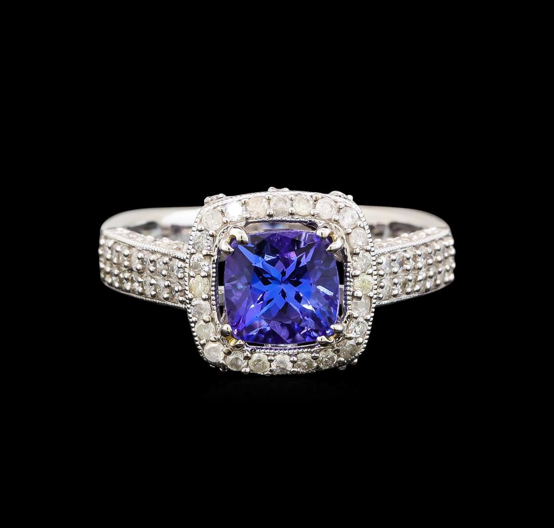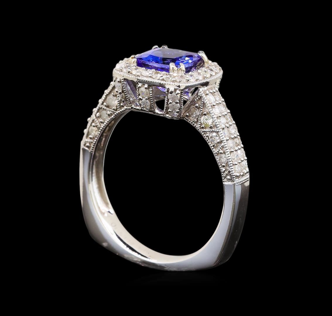 One electronically tested 14KT white gold ladies cast tanzanite and diamond ring with a flat shank with a bright polish finish. Trademark is Orianne. Identified with markings of "14K". Condition is new. Containing: One prong set square cushion modified brilliant cut natural tanzanite, measuring 6.60 x 6.53 x 4.61mm, approximate weight of 1.56ct., clarity is eye clean, type I, medium light, very slightly grayish, violet color, (GIA V 4/3), cut is good. Eighty-Four prong set round brilliant cut diamonds, measuring 1.20 - 1.20 x 0.72mm (depth est.) approximate total weight of 84 Stones = 0.53ct. Clarity: I-1 to I-2. Color: I - J. All diamonds and colored gemstones are graded in the mounting, unless otherwise stated. Colored gemstones are presumed to have been subjected to commonly used enhancement processes.. Total Weight of Colored Stones 1.56ct. Total Weight of Diamonds 0.53ct. Total Weight of Ring 4.70 grams. GGL Appraised at $3,800.00.