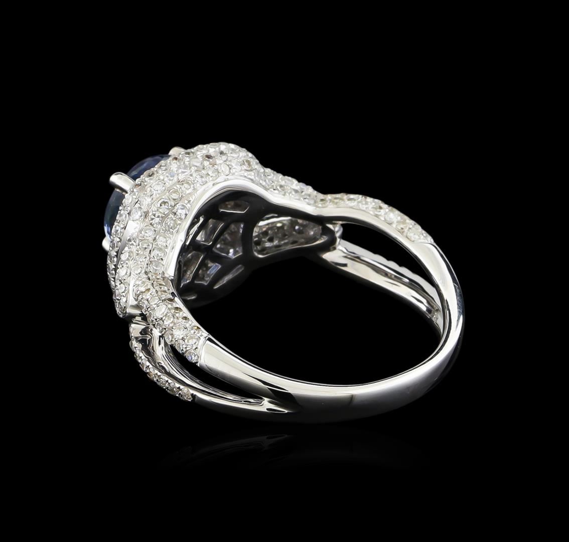 One electronically tested 14KT white gold ladies combination cast & assembled tanzanite and diamond ring with a split shank with a bright polish finish. Identified with markings of "14K". Condition is new. Containing: One prong set round modified brilliant cut natural tanzanite, measuring 6.99 - 6.99 x 4.76 mm, approximate weight of 1.56ct., clarity is eye clean, type I, medium light, moderately strong, violet color, (GIA V 4/4), cut is very good. Two Hundred Seventy-Five prong set single cut diamonds, measuring 1.00 - 1.00 x 0.60mm (depth est.) approximate total weight of 275 Stones = 1.08ct. Clarity: VS-2. Color: G, Cut is Good. Colored gemstones are presumed to have been subjected to commonly used enhancement processes. All diamonds and colored gemstones are graded in the mounting, unless otherwise stated. Total Weight of Colored Stones 1.56ct. Total Weight of Diamonds 1.08ct. Total Weight of Ring 5.60 grams. GGL Appraised at $6,890.00.