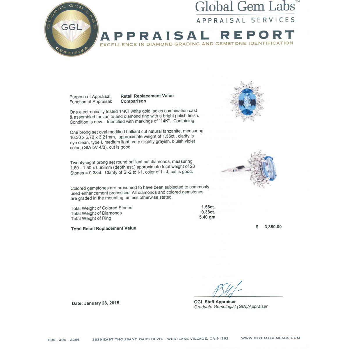 One electronically tested 14KT white gold ladies combination cast & assembled tanzanite and diamond ring with a bright polish finish. Identified with markings of "14K". Condition is new. Containing: One prong set oval modified brilliant cut natural tanzanite, measuring 10.30 x 6.70 x 3.21mm, approximate weight of 1.56ct., clarity is eye clean, type I, medium light, very slightly grayish, bluish violet color, (GIA bV 4/3), cut is good. Twenty-Eight prong set round brilliant cut diamonds, measuring 1.60 - 1.50 x 0.93mm (depth est.) approximate total weight of 28 Stones = 0.38ct. Clarity: SI-2 to I-1. Color: I - J, Cut is Good. Colored gemstones are presumed to have been subjected to commonly used enhancement processes. All diamonds and colored gemstones are graded in the mounting, unless otherwise stated. Total Weight of Colored Stones 1.56ct. Total Weight of Diamonds 0.38ct. Total Weight of Ring 5.40 grams. GGL Appraised at $3,880.00.