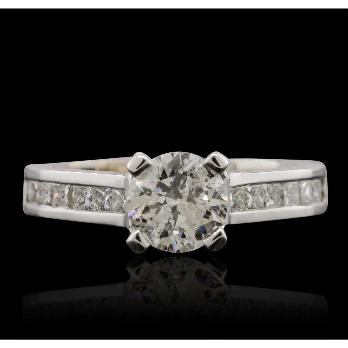 One electronically tested 14KT white gold Ladies combination cast & assembled engagement ring with a bright polish finish. Condition is new. Identified with markings of "14K". Containing: One prong set round brilliant cut diamond, measuring 6.47 - 6.46 x 3.88mm (depth est.) approximate weight of 1.06ct. Clarity: I-1. Color: G - H, Cut is Good. Fourteen channel set princess cut diamonds, measuring 1.80 x 1.80 x 1.35mm (depth est.) approximate. Total Weight of 14 Stones = 0.50ct. Clarity: VS-2 to SI-2. Color: F - G, Cut is Good. EGL USA GEM ID# US 911348409D. All diamonds are graded in the mounting, unless otherwise stated. Total Weight of Diamonds 1.56ct. Total Weight of Engagement Ring 5.00 grams. GGL Appraised at $19,390.00.