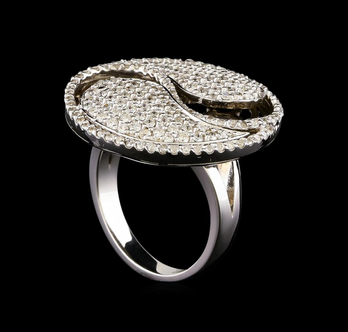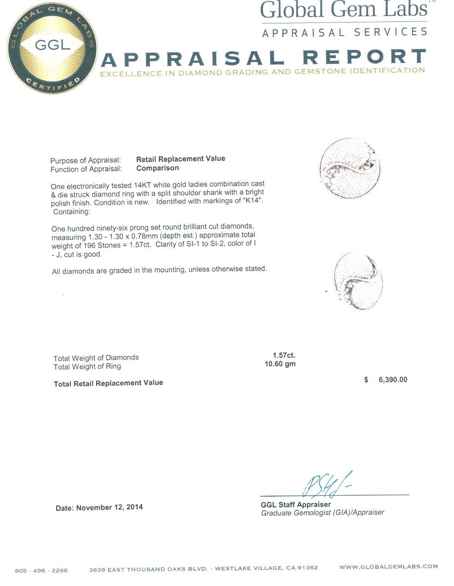 One electronically tested 14KT white gold ladies combination cast & die struck diamond ring with a split shoulder shank with a bright polish finish. Identified with markings of "K14". Condition is new. Containing: One Hundred Ninety-Six prong set round brilliant cut diamonds, measuring 1.30 - 1.30 x 0.78mm (depth est.) approximate total weight of 196 Stones = 1.57ct. Clarity: SI-1 to SI-2. Color: I - J, Cut is Good. All diamonds are graded in the mounting, unless otherwise stated. Total Weight of Diamonds 1.57ct. Total Weight of Ring 10.60 grams. GGL Appraised at $6,390.00.
