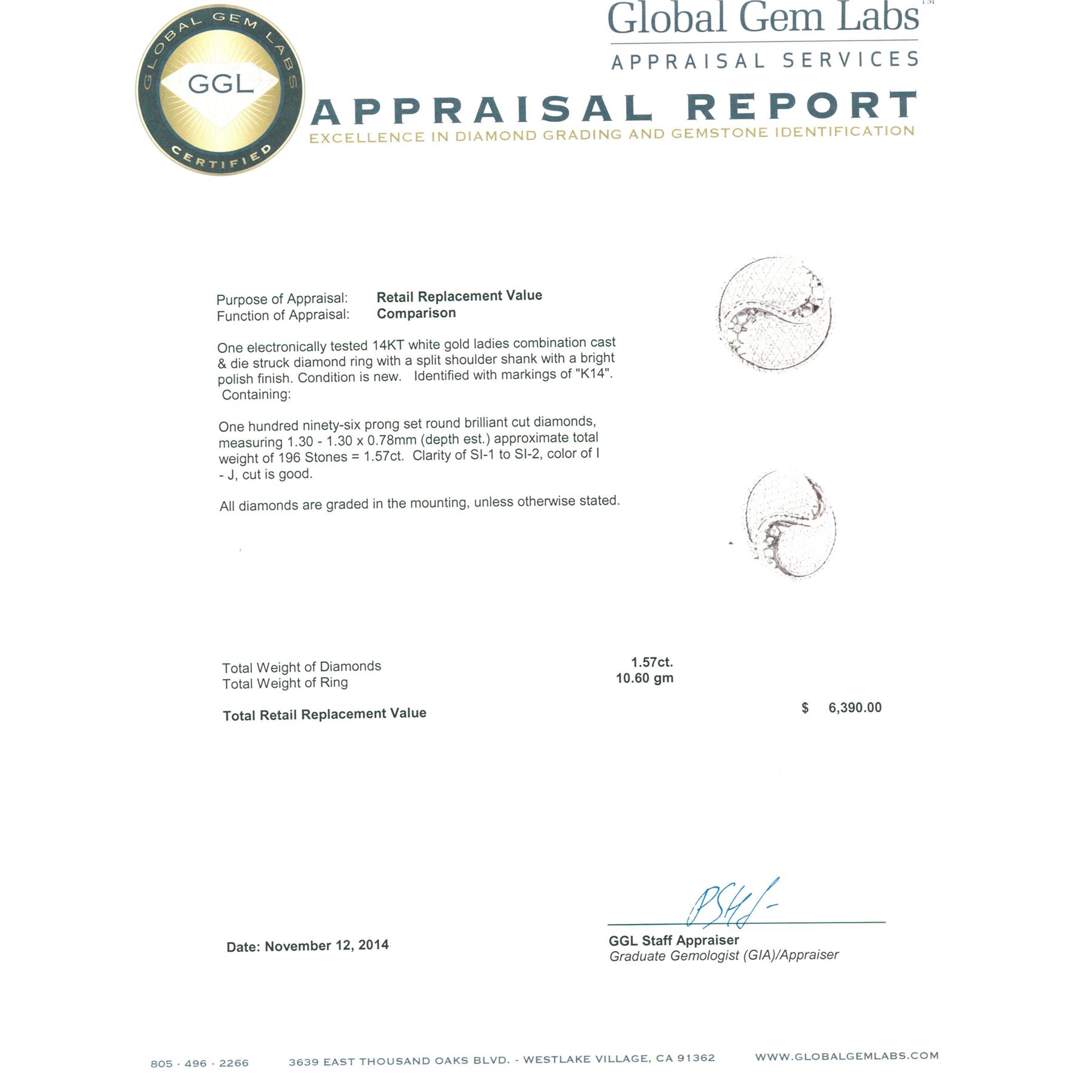 One electronically tested 14KT white gold ladies combination cast & die struck diamond ring with a split shoulder shank with a bright polish finish. Identified with markings of "K14". Condition is new. Containing: One Hundred Ninety-Six prong set round brilliant cut diamonds, measuring 1.30 - 1.30 x 0.78mm (depth est.) approximate total weight of 196 Stones = 1.57ct. Clarity: SI-1 to SI-2. Color: I - J, Cut is Good. All diamonds are graded in the mounting, unless otherwise stated. Total Weight of Diamonds 1.57ct. Total Weight of Ring 10.60 grams. GGL Appraised.