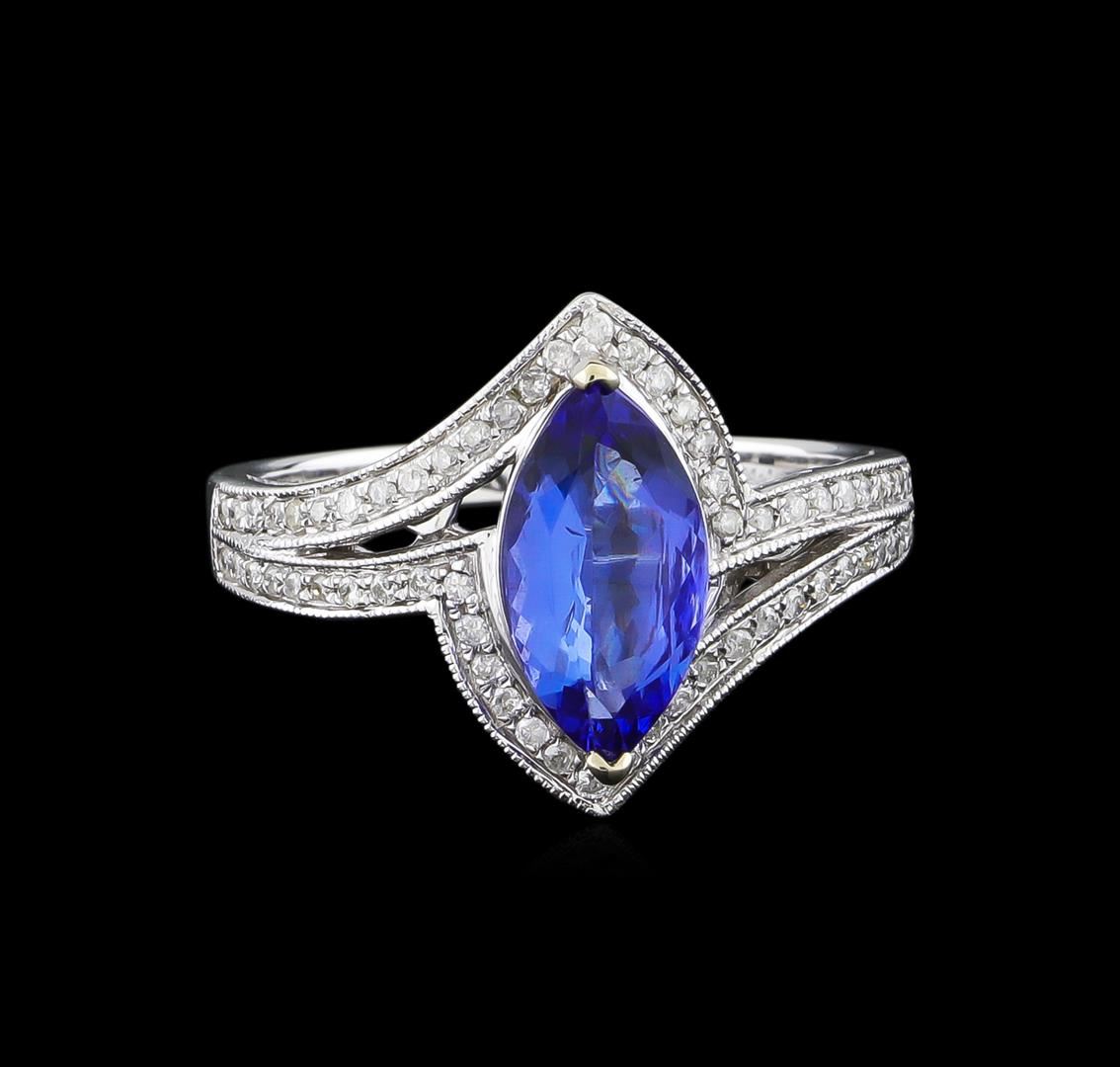 One electronically tested 14KT white gold ladies cast tanzanite and diamond ring. The featured tanzanite is set within mirroring diamond ribbons, completed by a two millimeter wide band. Bright polish finish with milgrain detailing throughout. Trademark is Orianne. Identified with markings of "14K". Condition is new, good workmanship. Containing: One prong set marquise brilliant cut natural tanzanite, measuring 11.40 x 6.00 x 3.40mm, 6% bulge factor, approximate weight of 1.57ct., clarity is eye clean, type I, medium dark, very slightly grayish, bluish violet color, (GIA bV 6/3), cut is good. Transmitting light with no distortion, transparent. Graded in the setting. Tanzanite is a very rare gemstone that is only found in the country of Tanzania. Originally discovered in 1967. Tiffany & Company, named the stone Tanzanite. It is found in the Usumburu Mountains that border the Umba Valley of northern Tanzania. Tanzanite occurs in gray, brown, violet, blue, reddish-purple, & green. The gem is interesting because of its exceptional pleochroism. Rotated in different directions a tanzanite will exhibit multiple changes of color. Tanzanite has a low tolerance to ultrasonic cleaning, and should not be cleaned using this method. Sixty prong set round brilliant cut diamonds, measuring 1.00 - 0.90 x 0.57mm (depth est.) approximate total weight of 60 Stones = 0.28ct. Graded in the setting. Clarity: I-2 to I-3. Color: G - I. Total Weight of Colored Stones 1.57ct. Total Weight of Diamonds 0.28ct. Total Weight of Ring 3.74 grams. AIG Appraised at $4,535.00.