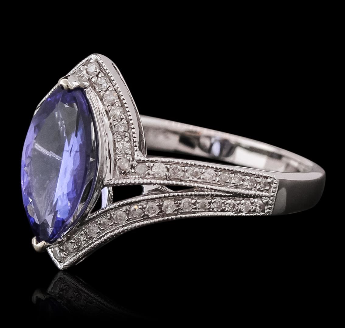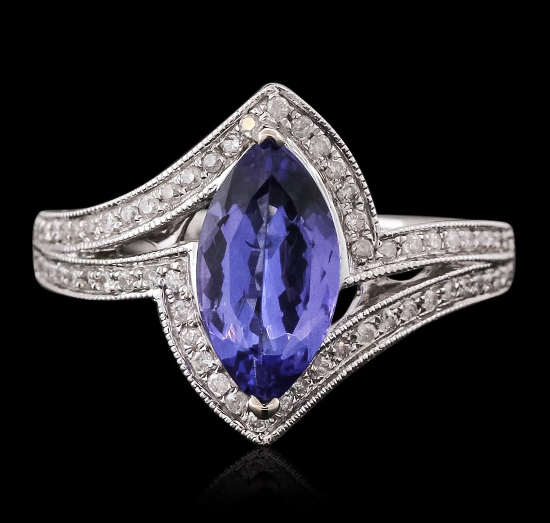 One electronically tested 14KT white gold ladies cast tanzanite and diamond ring. The featured tanzanite is set within mirroring diamond ribbons, completed by a two millimeter wide band. Bright polish finish with milgrain detailing throughout. Trademark is Orianne. Identified with markings of "14K". Condition is new, good workmanship. Containing: One prong set marquise brilliant cut natural tanzanite, measuring 11.40 x 6.00 x 3.40mm, 6% bulge factor, approximate weight of 1.57ct., clarity is eye clean, type I, medium dark, very slightly grayish, bluish violet color, (GIA bV 6/3), cut is good. Transmitting light with no distortion, transparent. Graded in the setting. Tanzanite is a very rare gemstone that is only found in the country of Tanzania. Originally discovered in 1967. Tiffany & Company, named the stone Tanzanite. It is found in the Usumburu Mountains that border the Umba Valley of northern Tanzania. Tanzanite occurs in gray, brown, violet, blue, reddish-purple, & green. The gem is interesting because of its exceptional pleochroism. Rotated in different directions a tanzanite will exhibit multiple changes of color. Tanzanite has a low tolerance to ultrasonic cleaning, and should not be cleaned using this method. Sixty prong set round brilliant cut diamonds, measuring 1.00 - 0.90 x 0.57mm (depth est.) approximate total weight of 60 Stones = 0.28ct. Graded in the setting. Clarity: I-2 to I-3. Color: G - I. Total Weight of Colored Stones 1.57ct. Total Weight of Diamonds 0.28ct. Total Weight of Ring 3.74 grams. AIG Appraised at $4,535.00.