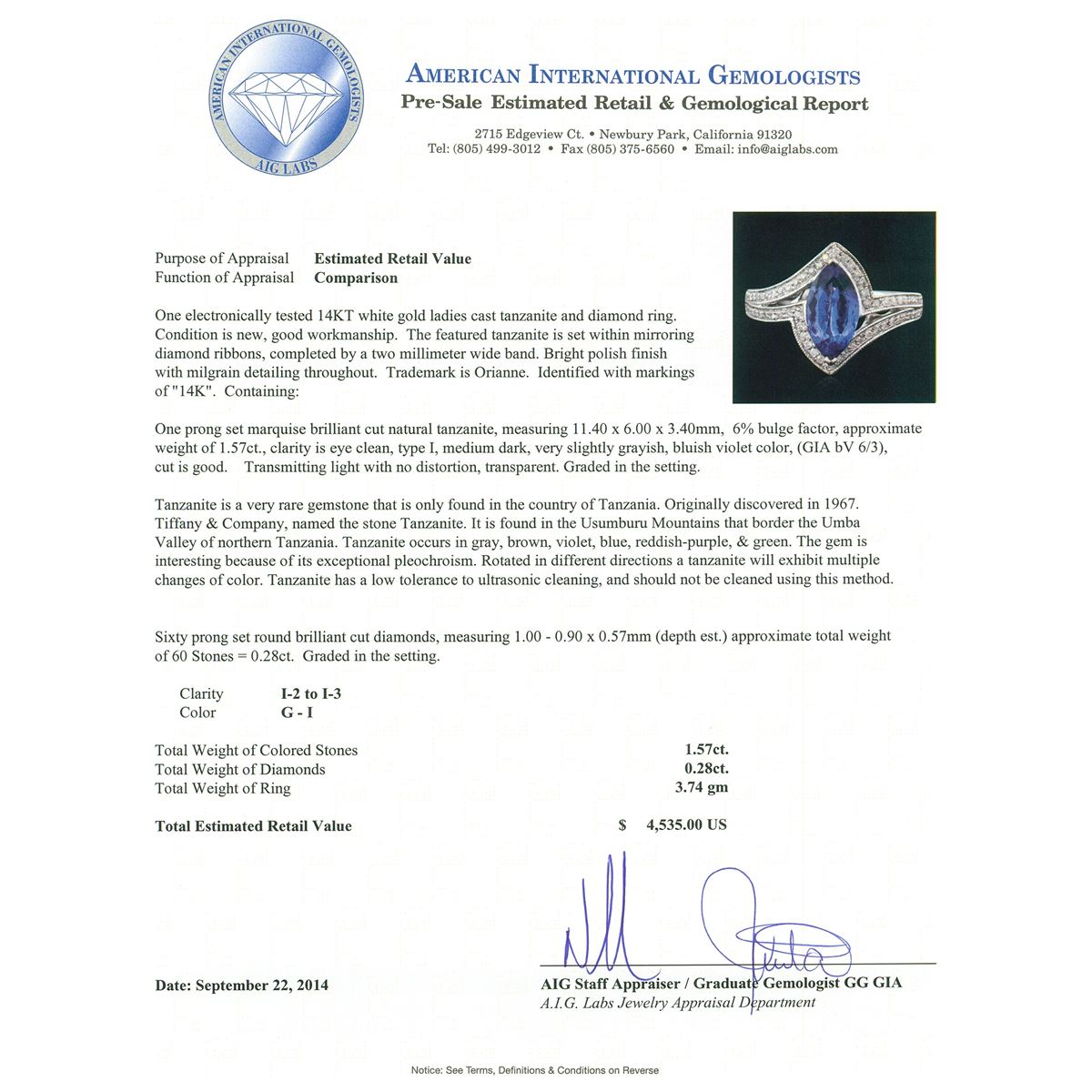 One electronically tested 14KT white gold ladies cast tanzanite and diamond ring. The featured tanzanite is set within mirroring diamond ribbons, completed by a two millimeter wide band. Bright polish finish with milgrain detailing throughout. Trademark is Orianne. Identified with markings of "14K". Condition is new, good workmanship. Containing: One prong set marquise brilliant cut natural tanzanite, measuring 11.40 x 6.00 x 3.40mm, 6% bulge factor, approximate weight of 1.57ct., clarity is eye clean, type I, medium dark, very slightly grayish, bluish violet color, (GIA bV 6/3), cut is good. Transmitting light with no distortion, transparent. Graded in the setting. Tanzanite is a very rare gemstone that is only found in the country of Tanzania. Originally discovered in 1967. Tiffany & Company, named the stone Tanzanite. It is found in the Usumburu Mountains that border the Umba Valley of northern Tanzania. Tanzanite occurs in gray, brown, violet, blue, reddish-purple, & green. The gem is interesting because of its exceptional pleochroism. Rotated in different directions a tanzanite will exhibit multiple changes of color. Tanzanite has a low tolerance to ultrasonic cleaning, and should not be cleaned using this method. Sixty prong set round brilliant cut diamonds, measuring 1.00 - 0.90 x 0.57mm (depth est.) approximate total weight of 60 Stones = 0.28ct. Graded in the setting. Clarity: I-2 to I-3. Color: G - I. Total Weight of Colored Stones 1.57ct. Total Weight of Diamonds 0.28ct. Total Weight of Ring 3.74 grams. AIG Appraised at $4,535.00.