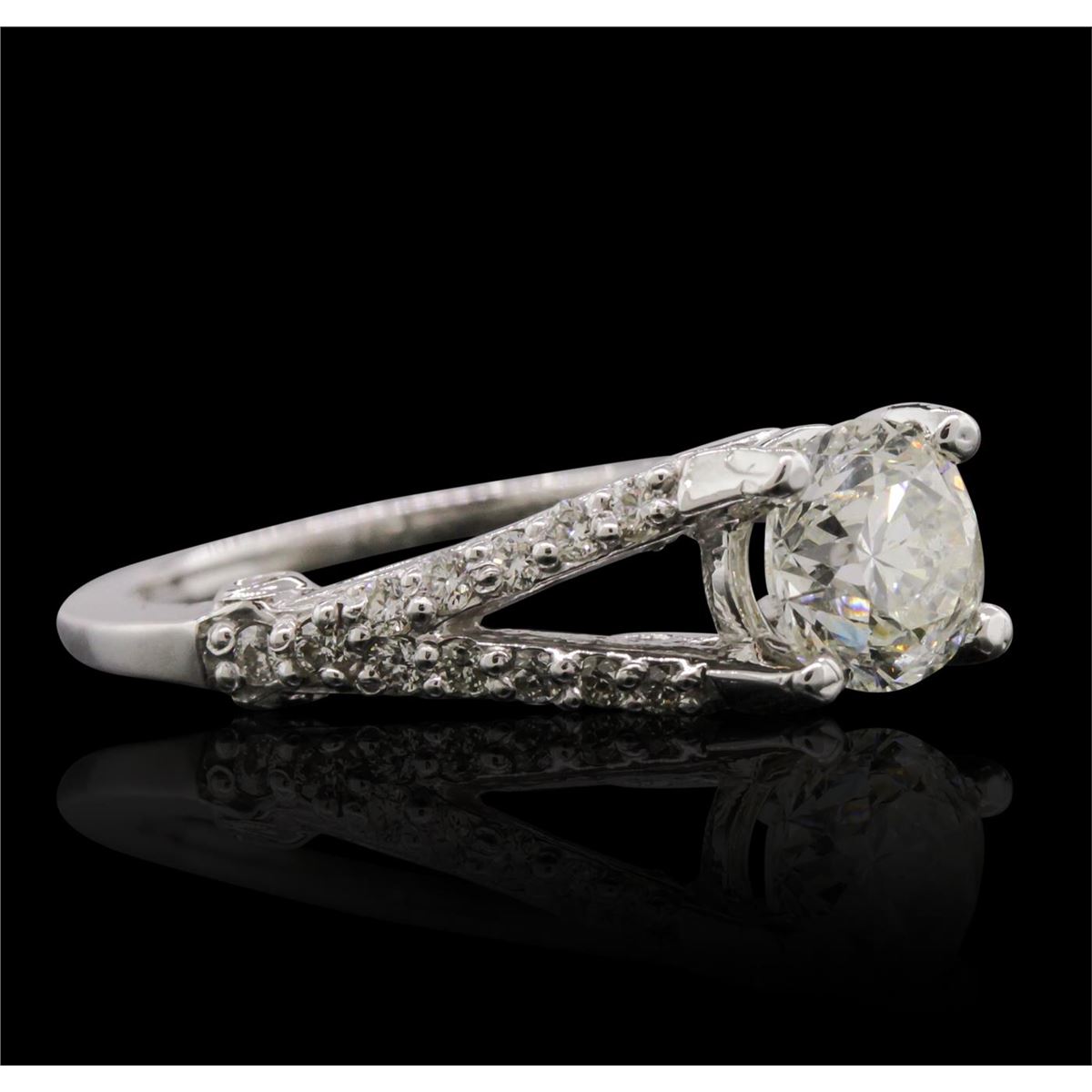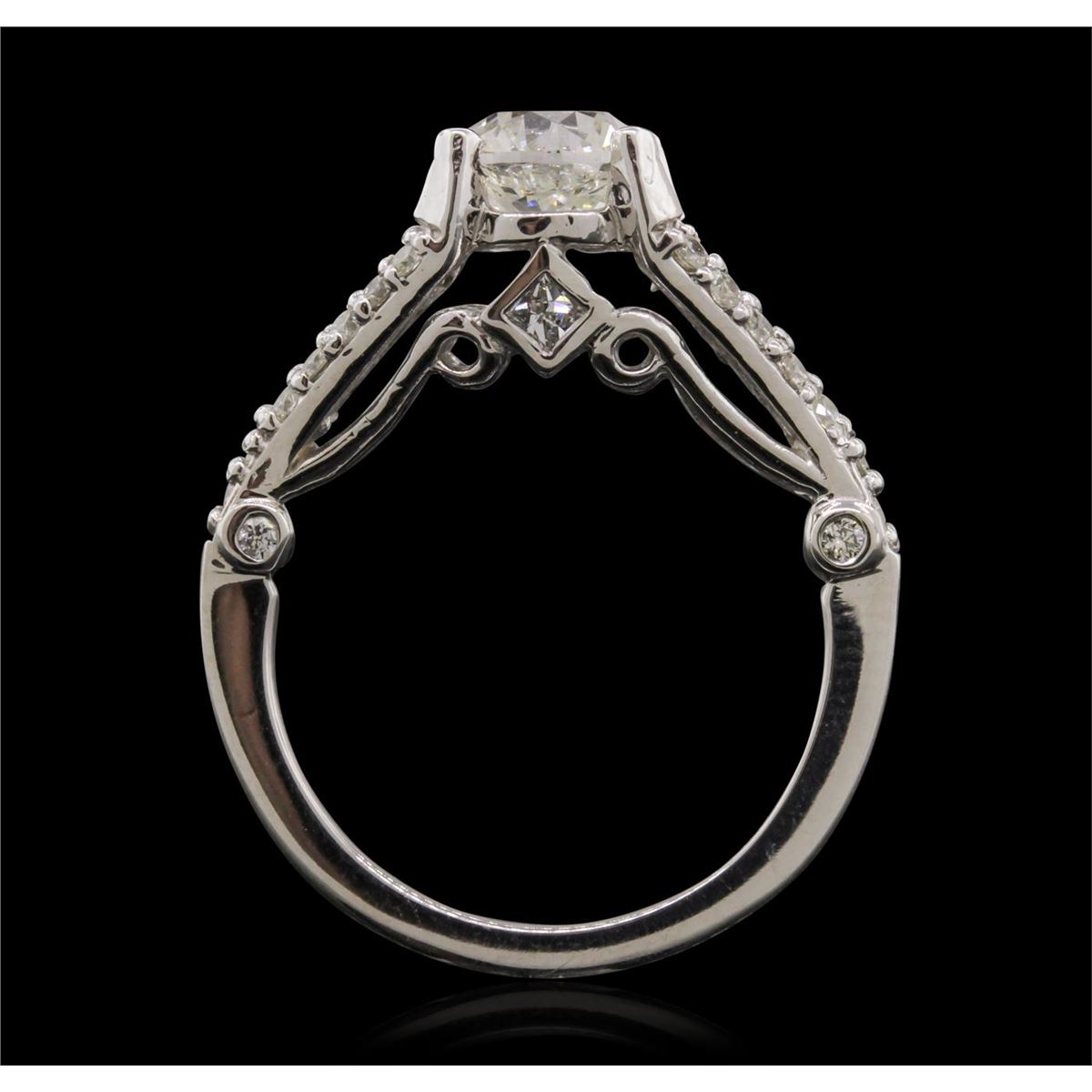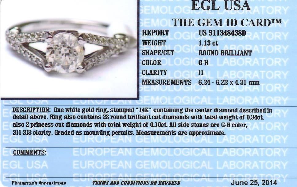 One electronically tested 14KT white gold Ladies combination cast & assembled engagement ring with a bright polish finish. Condition is new. Identified with markings of "14K". Containing: One prong set round brilliant cut diamond, measuring 6.24 - 6.22 x 4.31mm (depth est.) approximate. Total Weight of 1.13ct. Clarity: I-1. Color: G, Cut is Good. Twenty-Eight prong set round brilliant cut diamonds, measuring 1.50 - 1.50 x 0.90mm (depth est.) approximate. Total Weight of 28 Stones = 0.34ct. Clarity: SI-1 to SI-3. Color: G - H, Cut is Good. Two prong set princess cut diamonds, measuring 2.00 x 2.00 x 1.50mm (depth est.) approximate. Total Weight of 2 Stones = 0.10ct. Clarity: SI-1 to SI-3. Color: G - H, Cut is Good. EGL USA GEM ID# US 911348438D. All diamonds are graded in the mounting, unless otherwise stated. Total Weight of Diamonds 1.57ct. Total Weight of Engagement Ring 3.70 grams. GGL Appraised at $21,215.00.