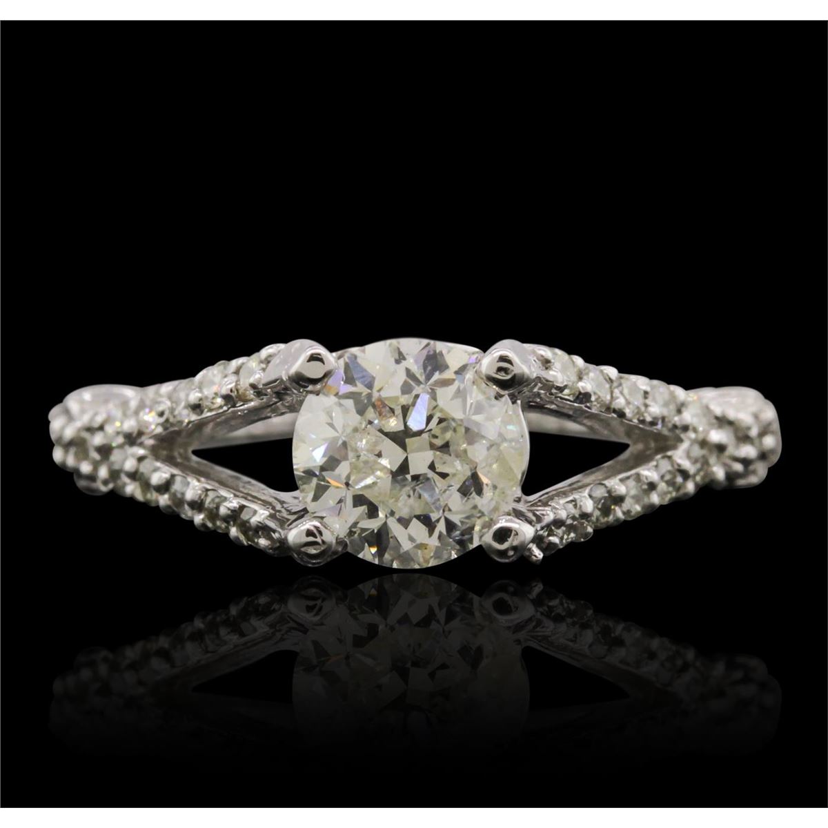 One electronically tested 14KT white gold Ladies combination cast & assembled engagement ring with a bright polish finish. Condition is new. Identified with markings of "14K". Containing: One prong set round brilliant cut diamond, measuring 6.24 - 6.22 x 4.31mm (depth est.) approximate. Total Weight of 1.13ct. Clarity: I-1. Color: G, Cut is Good. Twenty-Eight prong set round brilliant cut diamonds, measuring 1.50 - 1.50 x 0.90mm (depth est.) approximate. Total Weight of 28 Stones = 0.34ct. Clarity: SI-1 to SI-3. Color: G - H, Cut is Good. Two prong set princess cut diamonds, measuring 2.00 x 2.00 x 1.50mm (depth est.) approximate. Total Weight of 2 Stones = 0.10ct. Clarity: SI-1 to SI-3. Color: G - H, Cut is Good. EGL USA GEM ID# US 911348438D. All diamonds are graded in the mounting, unless otherwise stated. Total Weight of Diamonds 1.57ct. Total Weight of Engagement Ring 3.70 grams. GGL Appraised at $21,215.00.