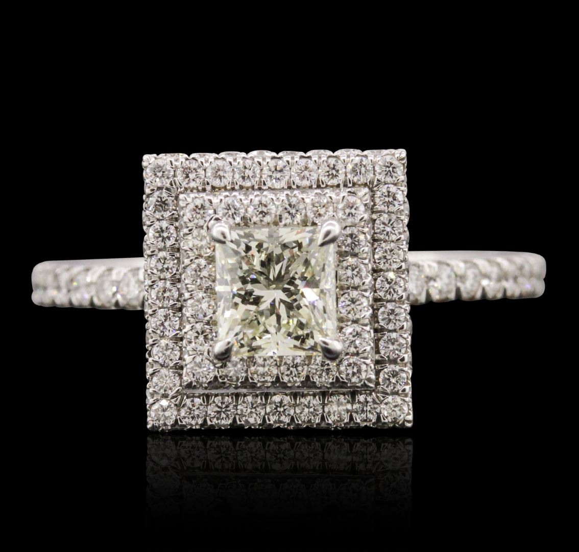 One electronically tested 14KT white gold Ladies combination cast & assembled engagement ring with a bright polish finish. Condition is very good. Containing: One prong set princess cut diamond, measuring 4.70 x 4.40 x 3.50mm (depth est.) approximate weight of 0.59ct. Clarity: VS-1. Color: L, Cut is Very Good. One Hundred Twenty-Two bead set round brilliant cut diamonds, measuring 1.30 - 1.30 x 0.78mm (depth est.) approximate. Total Weight of 122 Stones = 0.98ct. Clarity: SI-2 to I-1. Color: I - J, Cut is Good. All diamonds are graded in the mounting, unless otherwise stated. Total Weight of Diamonds 1.57ct. Total Weight of Engagement Ring 3.40 grams.. GGL Appraised at $7,115.00.