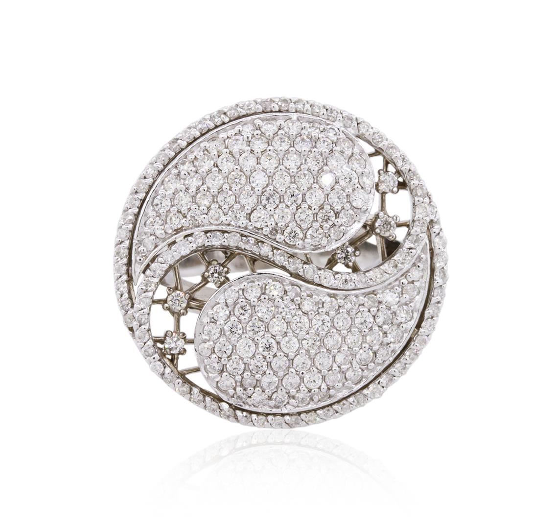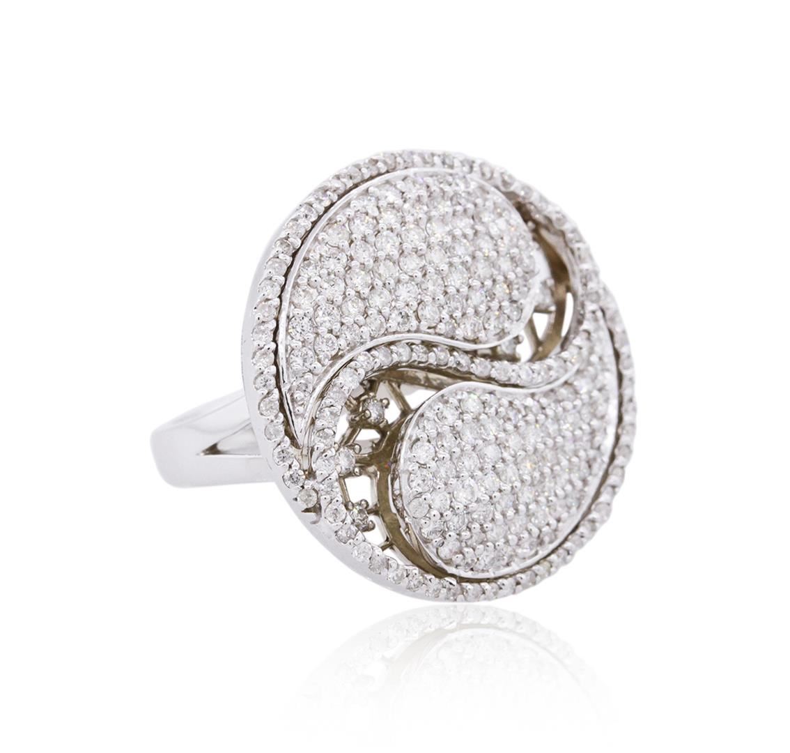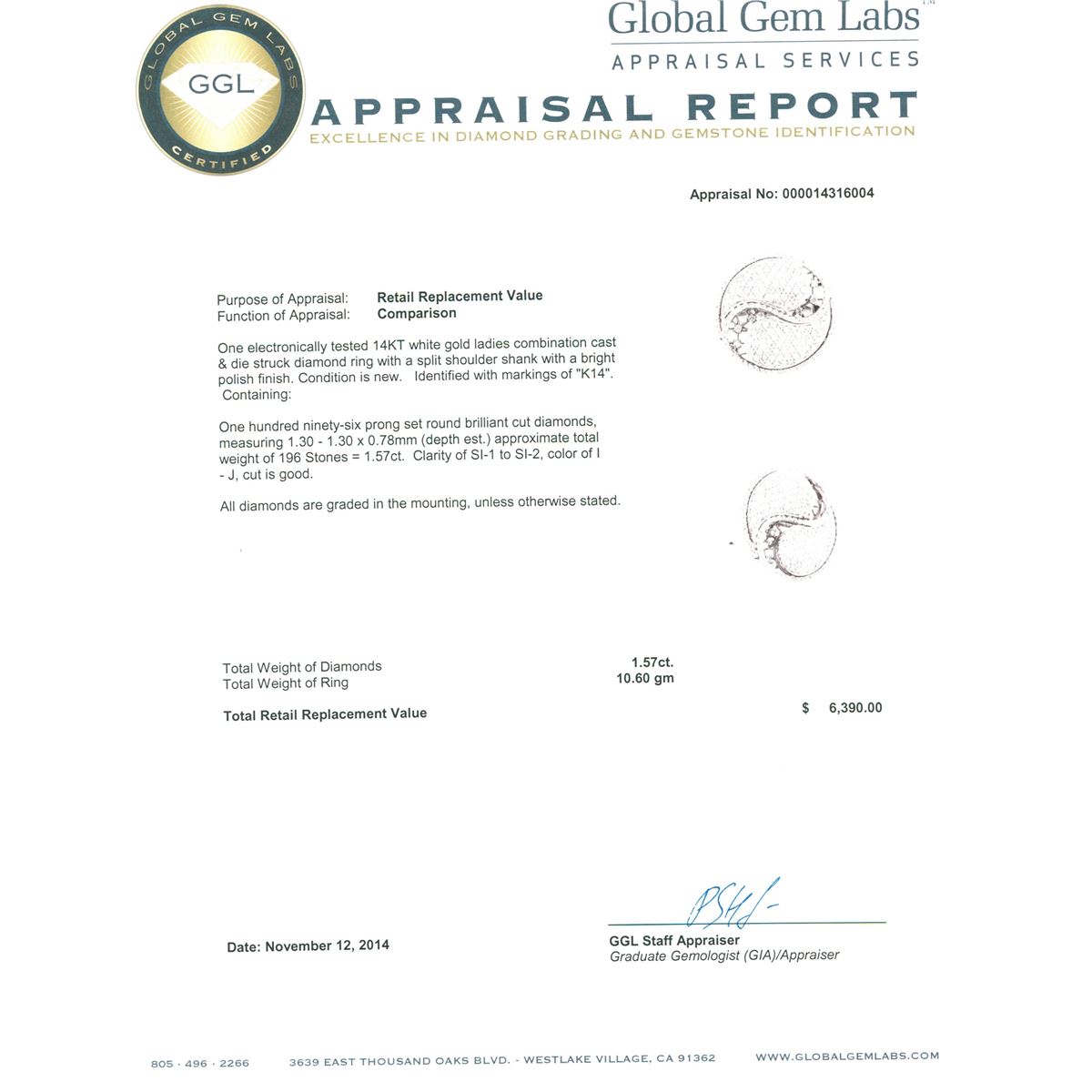 One electronically tested 14KT white gold ladies combination cast & die struck diamond ring with a split shoulder shank with a bright polish finish. Identified with markings of "K14". Condition is new. Containing: One Hundred Ninety-Six prong set round brilliant cut diamonds, measuring 1.30 - 1.30 x 0.78mm (depth est.) approximate total weight of 196 Stones = 1.57ct. Clarity: SI-1 to SI-2. Color: I - J, Cut is Good. All diamonds are graded in the mounting, unless otherwise stated. Total Weight of Diamonds 1.57ct. Total Weight of Ring 10.60 grams. GGL Appraised at $6,390.00.