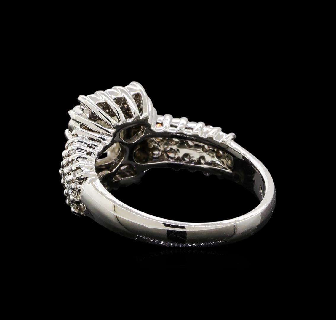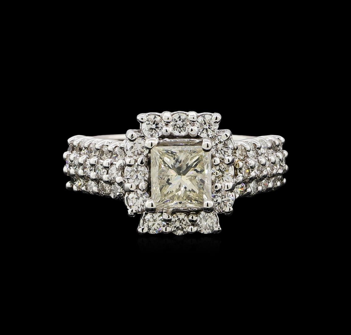 One electronically tested 14KT white gold ladies cast diamond engagement ring. Identified with markings of "14K". Condition is new. Containing: One prong set princess cut diamond, measuring 5.50 x 5.20 x 3.90mm (depth est.) approximate weight of 0.92ct. Clarity: I-1. Color: L, Cut is Good. Forty-Two prong set round brilliant cut diamonds, measuring 2.00 - 1.30 x 0.99mm (depth est.) approximate total weight of 42 Stones = 0.66ct. Clarity: SI-1 to I-1. Color: I - J, Cut is Good. Diamonds are graded in the mounting, unless otherwise stated. Total Weight of Diamonds 1.58ct. Total Weight of Engagement Ring 5.00 grams. GGL Appraised at $4,450.00.