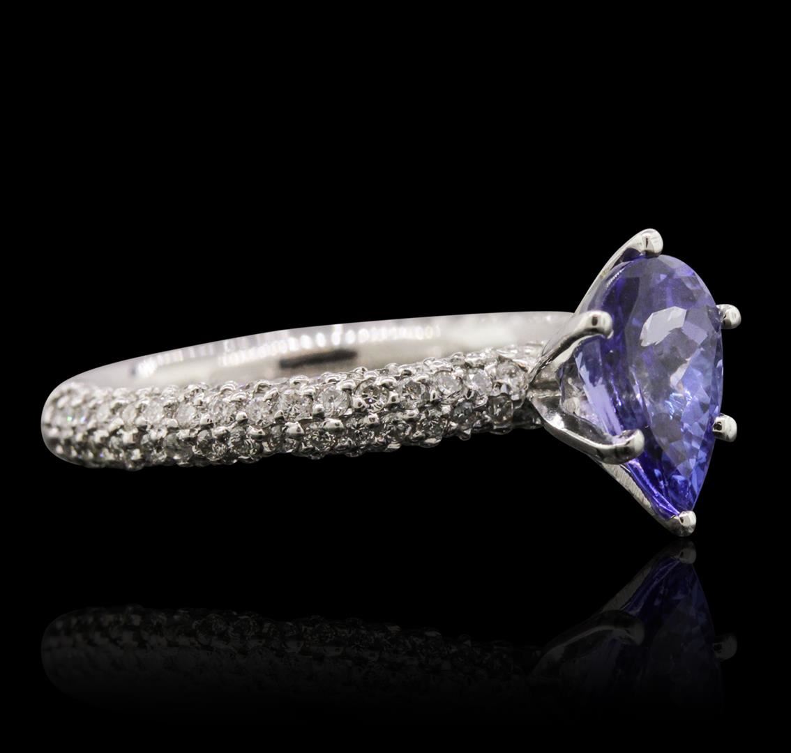 One electronically tested 14KT white gold ladies cast tanzanite and diamond ring with a bright polish finish. The featured tanzanite is supported by diamond set shoulders, completed by a three millimeter wide band. Identified with markings of "14K". Condition is new, good workmanship. Containing: One prong set pear brilliant cut natural tanzanite, measuring 9.00 x 5.80 x 4.00mm, 6%. bulge factor, approximate weight of 1.58ct., clarity is eye clean, type I, medium dark, moderately strong, bluish violet color, (GIA bV 6/4), cut is good. Transmitting light with no distortion, transparent. Graded in the setting. Tanzanite is a very rare gemstone that is only found in the country of Tanzania. Originally discovered in 1967. Tiffany & Company, named the stone Tanzanite. It is found in the Usumburu Mountains that border the Umba Valley of northern Tanzania. Tanzanite occurs in gray, brown, violet, blue, reddish-purple, & green. The gem is interesting because of its exceptional pleochroism. Rotated in different directions a tanzanite will exhibit multiple changes of color. Tanzanite has a low tolerance to ultrasonic cleaning, and should not be cleaned using this method. One Hundred Twenty-Eight pave set round brilliant cut diamonds, measuring 1.30 - 1.20 x 0.75mm (depth est.) approximate total weight of 128 Stones = 0.96ct. Graded in the setting. Clarity: SI-1 to I-1. Color: G - I. Total Weight of Colored Stones 1.58ct. Total Weight of Diamonds 0.96ct. Total Weight of Ring 3.56 grams. AIG Appraised at $7,155.00.