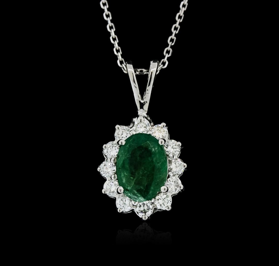 One pendant with chain featuring: 14KT white gold weighing 2.27 grams containing one emerald with a total weight of 1.58ct and prong set round diamonds with a total weight of 0.52ct.