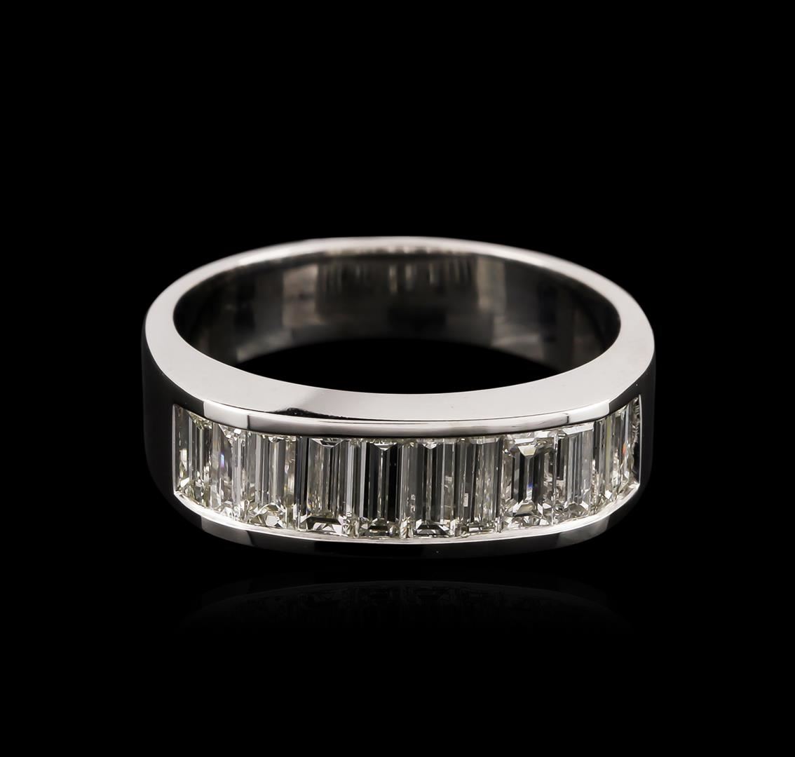 One electronically tested 14KT white gold ladies cast diamond ring with a bright polish finish. The ring features a diamond set curvature, completed by a four and one-half millimeter wide band. Identified with markings of "14K". Condition is good. Containing: Eleven channel set baguette cut diamonds, measuring from 4.30 x 2.20 x 1.54mm (depth est.) to 4.60 x 2.30 x 1.61mm (depth est.) approximate total weight of 11 Stones = 1.58ct. Graded in the setting. Clarity: VS-1 to VS-2. Color: F - H. Total Weight of Diamonds 1.58ct. Total Weight of Ring 6.27 grams. AIG Appraised at $6,895.00.