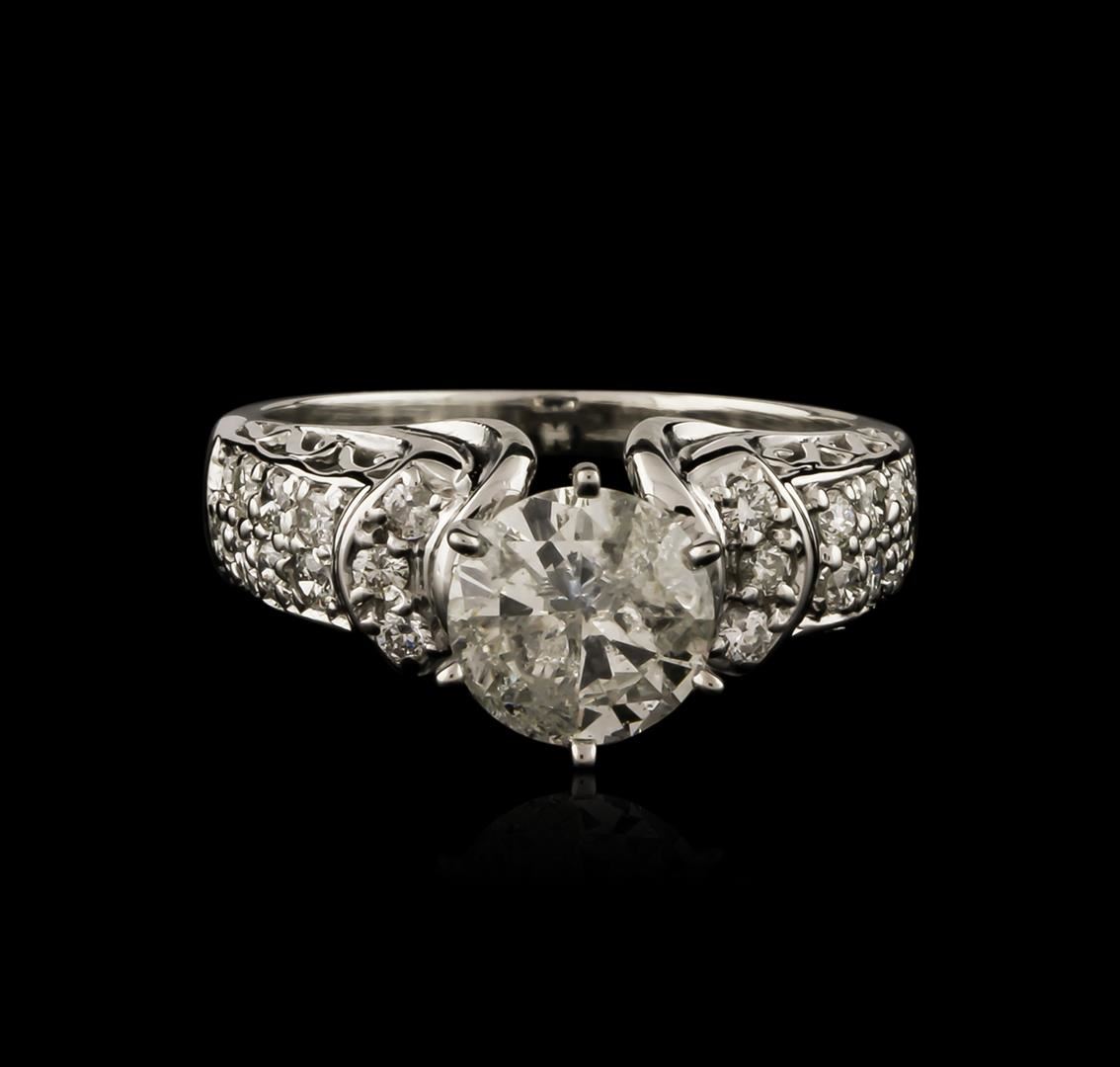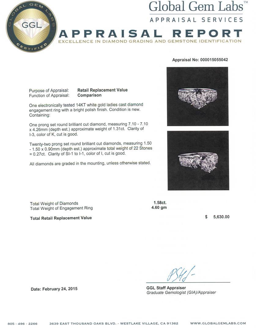 One electronically tested 14KT white gold ladies cast diamond engagement ring with a bright polish finish. Condition is new. Containing: One prong set round brilliant cut diamond, measuring 7.10 - 7.10 x 4.26mm (depth est.) approximate weight of 1.31ct. Clarity: I-3. Color: K, Cut is Good. Twenty-Two prong set round brilliant cut diamonds, measuring 1.50 - 1.50 x 0.90mm (depth est.) approximate total weight of 22 Stones = 0.27ct. Clarity: SI-1 to I-1. Color: I, Cut is Good. All diamonds are graded in the mounting, unless otherwise stated. Total Weight of Diamonds 1.58ct. Total Weight of Engagement Ring 4.60 grams. GGL Appraised at $5,630.00.