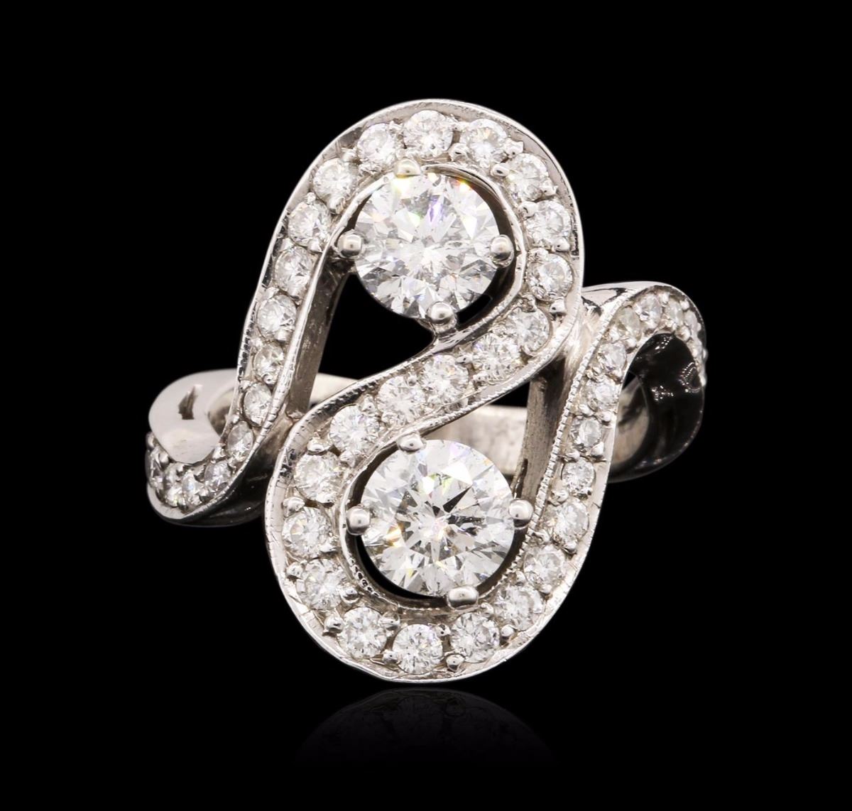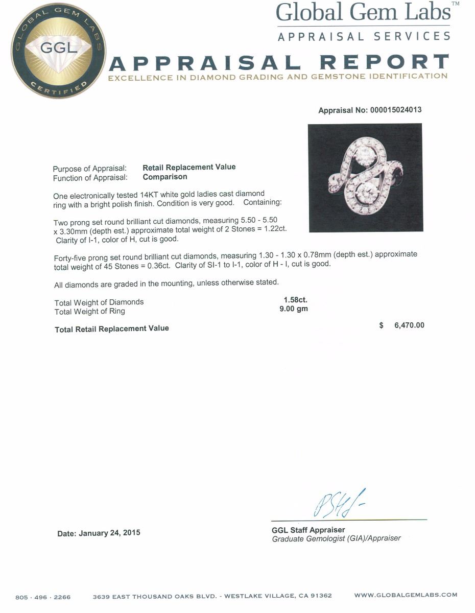 One electronically tested 14KT white gold ladies cast diamond ring with a bright polish finish. Condition is very good. Containing: Two prong set round brilliant cut diamonds, measuring 5.50 - 5.50 x 3.30mm (depth est.) approximate total weight of 2 Stones = 1.22ct. Clarity: I-1. Color: H, Cut is Good. Forty-Five prong set round brilliant cut diamonds, measuring 1.30 - 1.30 x 0.78mm (depth est.) approximate total weight of 45 Stones = 0.36ct. Clarity: SI-1 to I-1. Color: H - I, Cut is Good. All diamonds are graded in the mounting, unless otherwise stated. Total Weight of Diamonds 1.58ct. Total Weight of Ring 9.00. grams. GGL Appraised at $6,470.00.