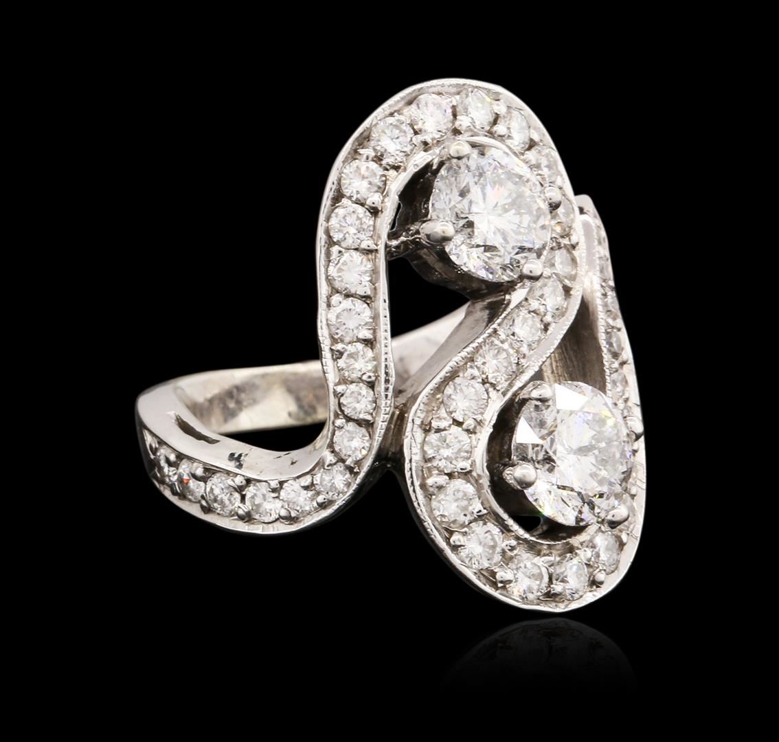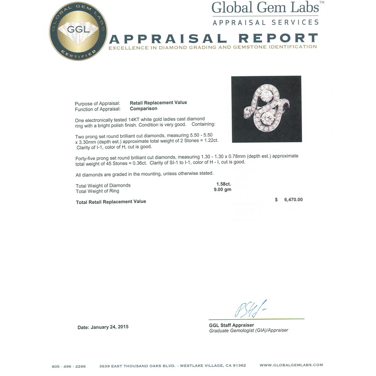 One electronically tested 14KT white gold ladies cast diamond ring with a bright polish finish. Condition is very good. Containing: Two prong set round brilliant cut diamonds, measuring 5.50 - 5.50 x 3.30mm (depth est.) approximate total weight of 2 Stones = 1.22ct. Clarity: I-1. Color: H, Cut is Good. Forty-Five prong set round brilliant cut diamonds, measuring 1.30 - 1.30 x 0.78mm (depth est.) approximate total weight of 45 Stones = 0.36ct. Clarity: SI-1 to I-1. Color: H - I, Cut is Good. All diamonds are graded in the mounting, unless otherwise stated. Total Weight of Diamonds 1.58ct. Total Weight of Ring 9.00. grams. GGL Appraised at $6,470.00.