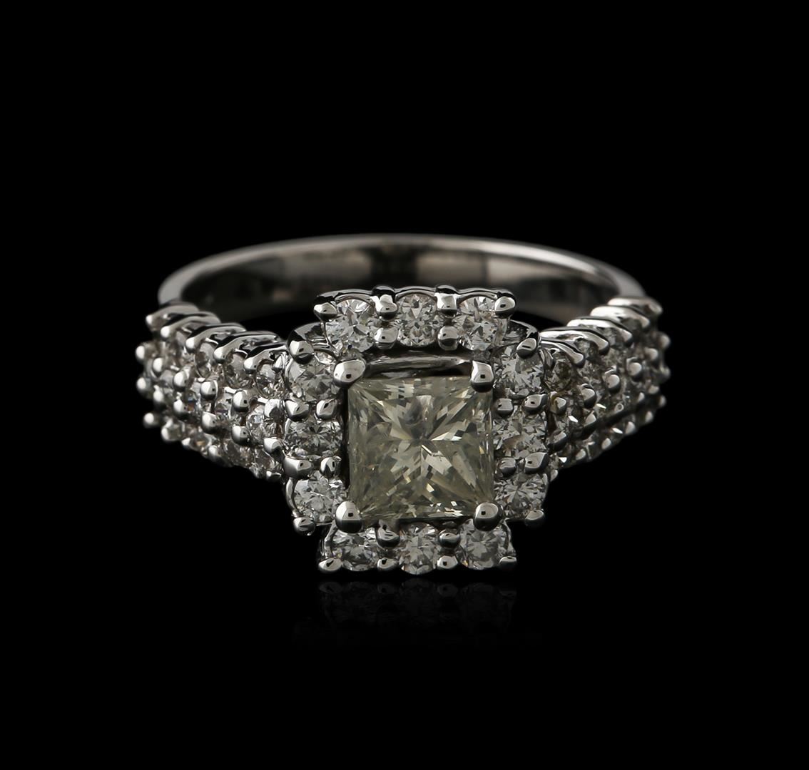 One electronically tested 14KT white gold ladies cast diamond engagement ring. Identified with markings of "14K". Condition is new. Containing: One prong set princess cut diamond, measuring 5.50 x 5.20 x 3.90mm (depth est.) approximate weight of 0.92ct. Clarity: I-1. Color: L, Cut is Good. Forty-Two prong set round brilliant cut diamonds, measuring 2.00 - 1.30 x 0.99mm (depth est.) approximate total weight of 42 Stones = 0.66ct. Clarity: SI-1 to I-1. Color: I - J, Cut is Good. Diamonds are graded in the mounting, unless otherwise stated. Total Weight of Diamonds 1.58ct. Total Weight of Engagement Ring 5.00 grams. GGL Appraised at $4,450.00.