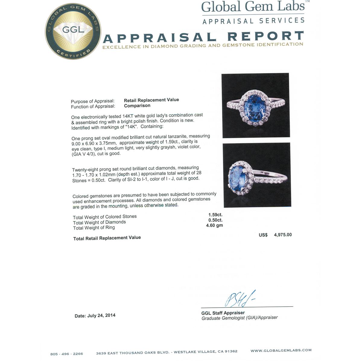 One electronically tested 14KT white gold ladies combination cast & assembled ring with a bright polish finish. Condition is new. Identified with markings of "14K". Containing: One prong set oval modified brilliant cut natural tanzanite, measuring 9.00 x 6.90 x 3.75mm, approximate weight of 1.59ct., clarity is eye clean, type I, medium light, very slightly grayish, violet color, (GIA V 4/3), cut is good. Twenty-Eight prong set round brilliant cut diamonds, measuring 1.70 - 1.70 x 1.02mm (depth est.) approximate total weight of 28 Stones = 0.50ct. Clarity: SI-2 to I-1. Color: I - J, Cut is Good. Colored gemstones are presumed to have been subjected to commonly used enhancement processes. All diamonds and colored gemstones are graded in the mounting, unless otherwise stated. Total Weight of Colored Stones 1.59ct. Total Weight of Diamonds 0.50ct. Total Weight of Ring 4.60 grams. GGL Appraised at $4,975.00.