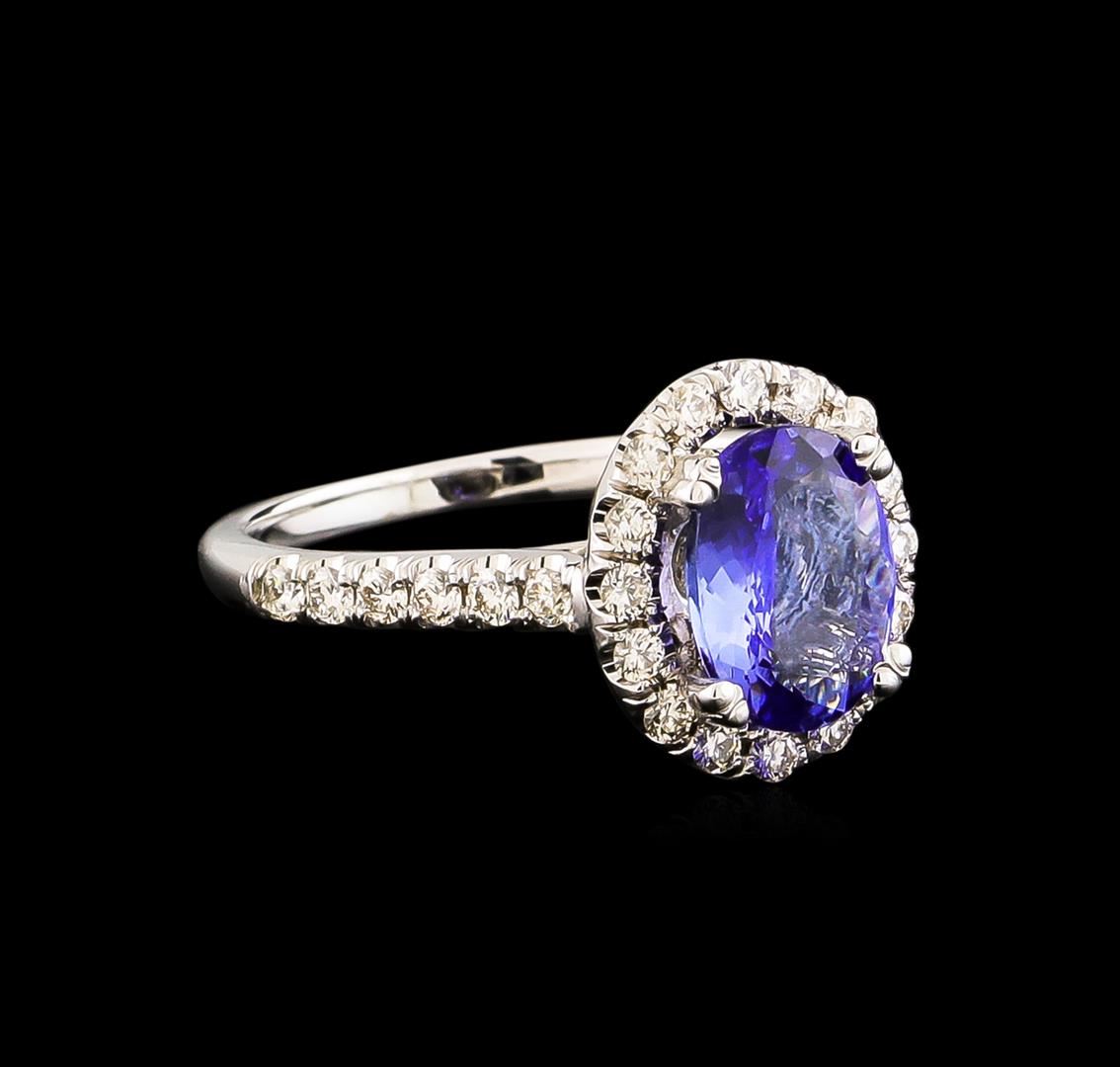 One electronically tested 14KT white gold ladies combination cast & assembled ring with a bright polish finish. Condition is new. Identified with markings of "14K". Containing: One prong set oval modified brilliant cut natural tanzanite, measuring 9.00 x 6.90 x 3.75mm, approximate weight of 1.59ct., clarity is eye clean, type I, medium light, very slightly grayish, violet color, (GIA V 4/3), cut is good. Twenty-Eight prong set round brilliant cut diamonds, measuring 1.70 - 1.70 x 1.02mm (depth est.) approximate total weight of 28 Stones = 0.50ct. Clarity: SI-2 to I-1. Color: I - J, Cut is Good. Colored gemstones are presumed to have been subjected to commonly used enhancement processes. All diamonds and colored gemstones are graded in the mounting, unless otherwise stated. Total Weight of Colored Stones 1.59ct. Total Weight of Diamonds 0.50ct. Total Weight of Ring 4.60 grams. GGL Appraised at $4,975.00.