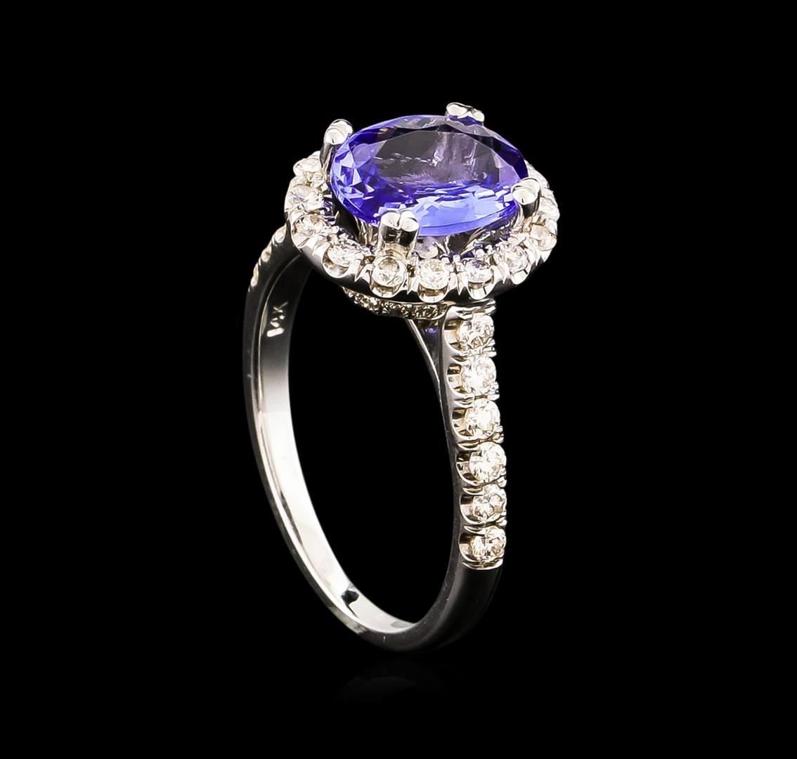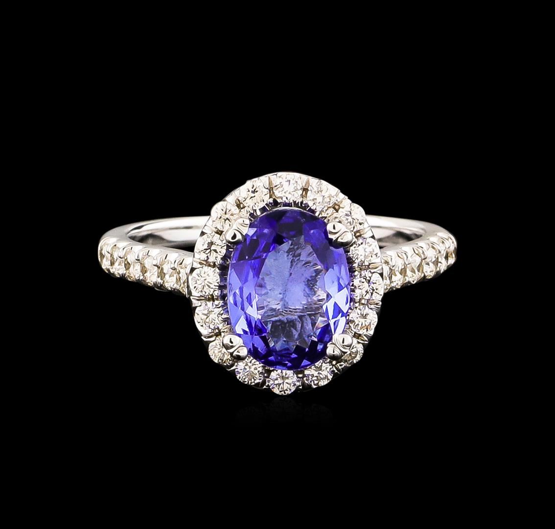 One electronically tested 14KT white gold ladies combination cast & assembled ring with a bright polish finish. Condition is new. Identified with markings of "14K". Containing: One prong set oval modified brilliant cut natural tanzanite, measuring 9.00 x 6.90 x 3.75mm, approximate weight of 1.59ct., clarity is eye clean, type I, medium light, very slightly grayish, violet color, (GIA V 4/3), cut is good. Twenty-Eight prong set round brilliant cut diamonds, measuring 1.70 - 1.70 x 1.02mm (depth est.) approximate total weight of 28 Stones = 0.50ct. Clarity: SI-2 to I-1. Color: I - J, Cut is Good. Colored gemstones are presumed to have been subjected to commonly used enhancement processes. All diamonds and colored gemstones are graded in the mounting, unless otherwise stated. Total Weight of Colored Stones 1.59ct. Total Weight of Diamonds 0.50ct. Total Weight of Ring 4.60 grams. GGL Appraised at $4,975.00.