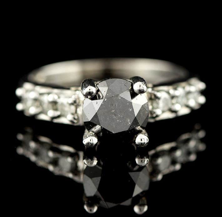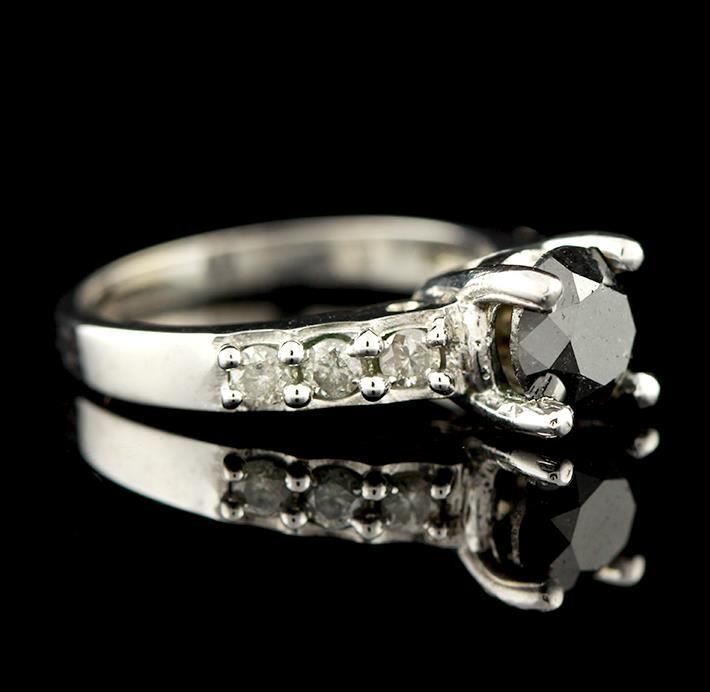 One polished, stamped, and electronically tested solid 14KT white gold ring featuring: 1 genuine round, brilliant cut diamond center stone with a total weight of 1.59ct, and 6 genuine round full cut diamonds with a total weight of 1.89ctw. This item weighs 5.0 grams, condition is new, very good workmanship. AIGL Appraised at $3,315.00.