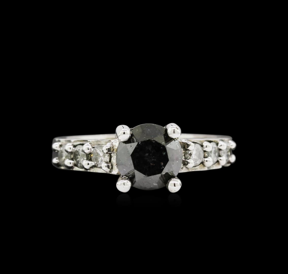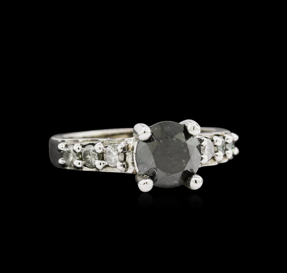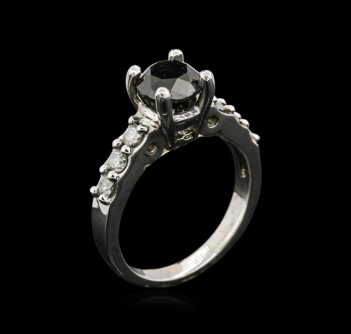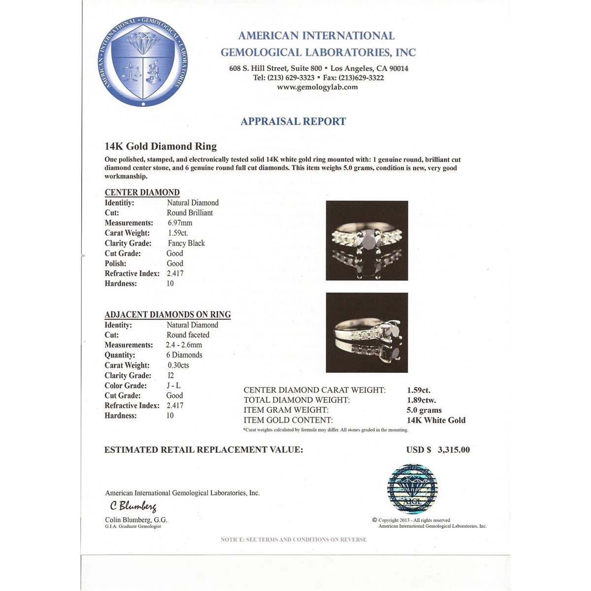 One polished, stamped, and electronically tested solid 14KT white gold ring featuring: 1 genuine round, brilliant cut diamond center stone with a total weight of 1.59ct, and 6 genuine round full cut diamonds with a total weight of 1.89ctw. This item weighs 5.0 grams, condition is new, very good workmanship. AIGL Appraised at $3,315.00.