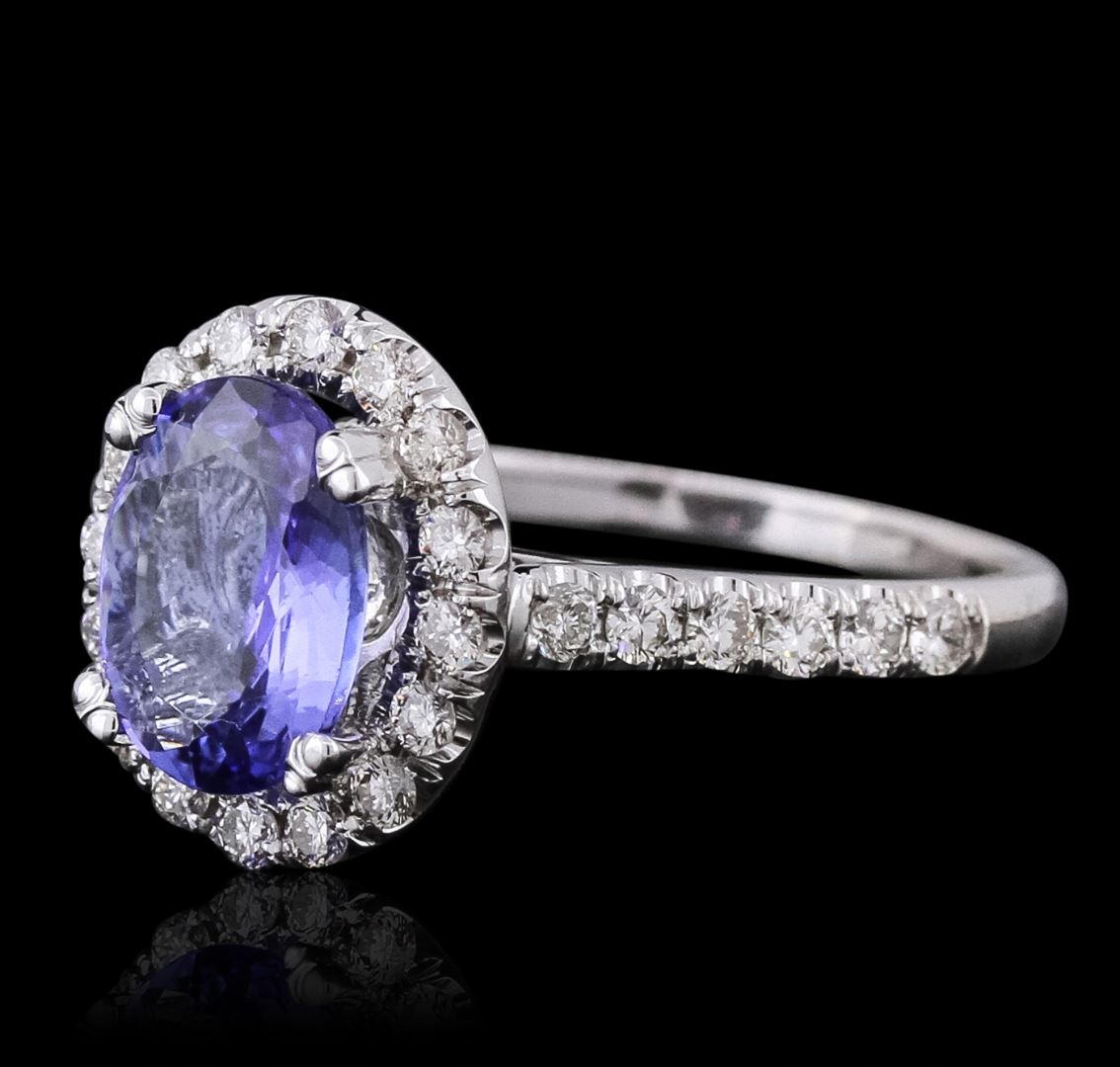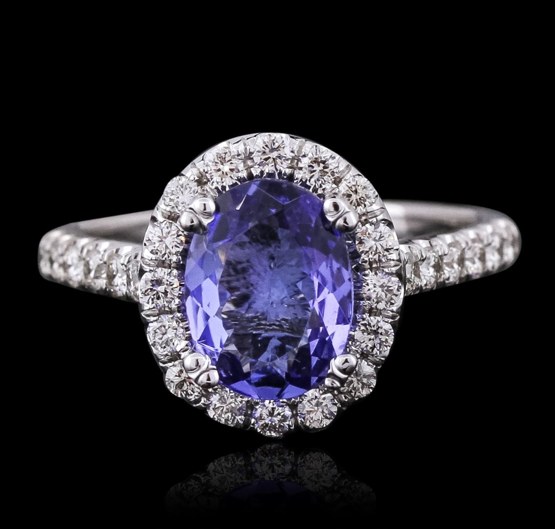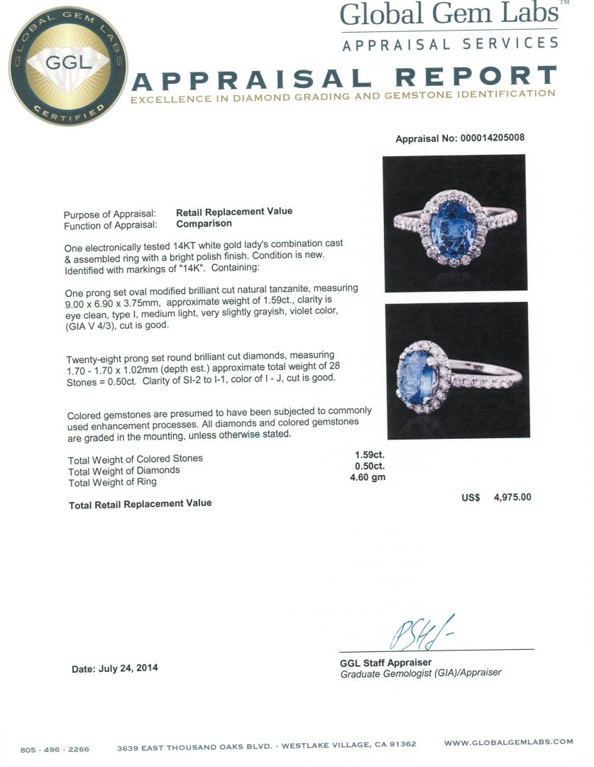 One electronically tested 14KT white gold ladies combination cast & assembled ring with a bright polish finish. Condition is new. Identified with markings of "14K". Containing: One prong set oval modified brilliant cut natural tanzanite, measuring 9.00 x 6.90 x 3.75mm, approximate weight of 1.59ct., clarity is eye clean, type I, medium light, very slightly grayish, violet color, (GIA V 4/3), cut is good. Twenty-Eight prong set round brilliant cut diamonds, measuring 1.70 - 1.70 x 1.02mm (depth est.) approximate total weight of 28 Stones = 0.50ct. Clarity: SI-2 to I-1. Color: I - J, Cut is Good. Colored gemstones are presumed to have been subjected to commonly used enhancement processes. All diamonds and colored gemstones are graded in the mounting, unless otherwise stated. Total Weight of Colored Stones 1.59ct. Total Weight of Diamonds 0.50ct. Total Weight of Ring 4.60 grams. GGL Appraised at $4,975.00.