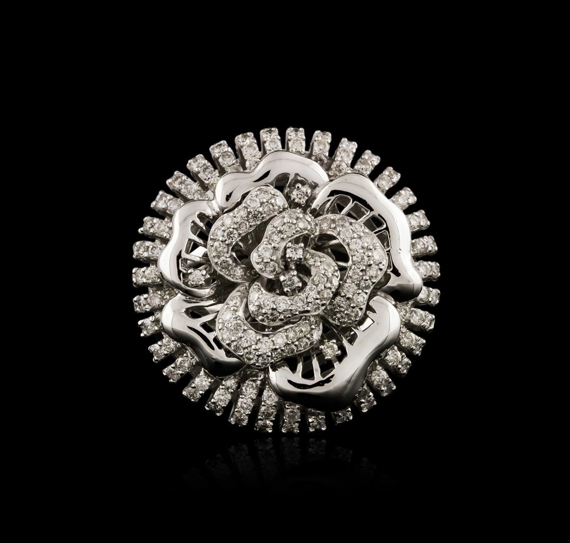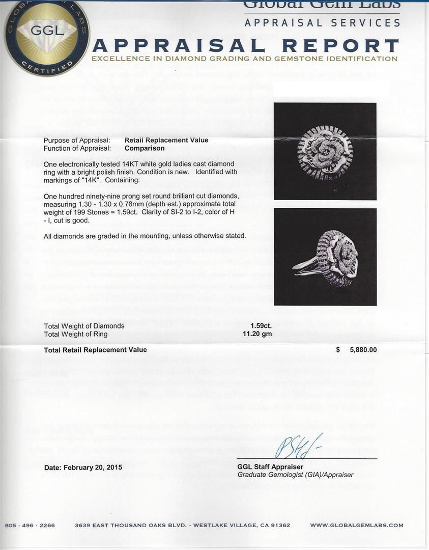 One electronically tested 14KT white gold ladies cast diamond ring with a bright polish finish. Identified with markings of "14K". Condition is new. Containing: One Hundred Ninety-Nine prong set round brilliant cut diamonds, measuring 1.30 - 1.30 x 0.78mm (depth est.) approximate total weight of 199 Stones = 1.59ct. Clarity: SI-2 to I-2. Color: H - I, Cut is Good. All diamonds are graded in the mounting, unless otherwise stated. Total Weight of Diamonds 1.59ct. Total Weight of Ring 11.20 grams. GGL Appraised at $5,880.00.