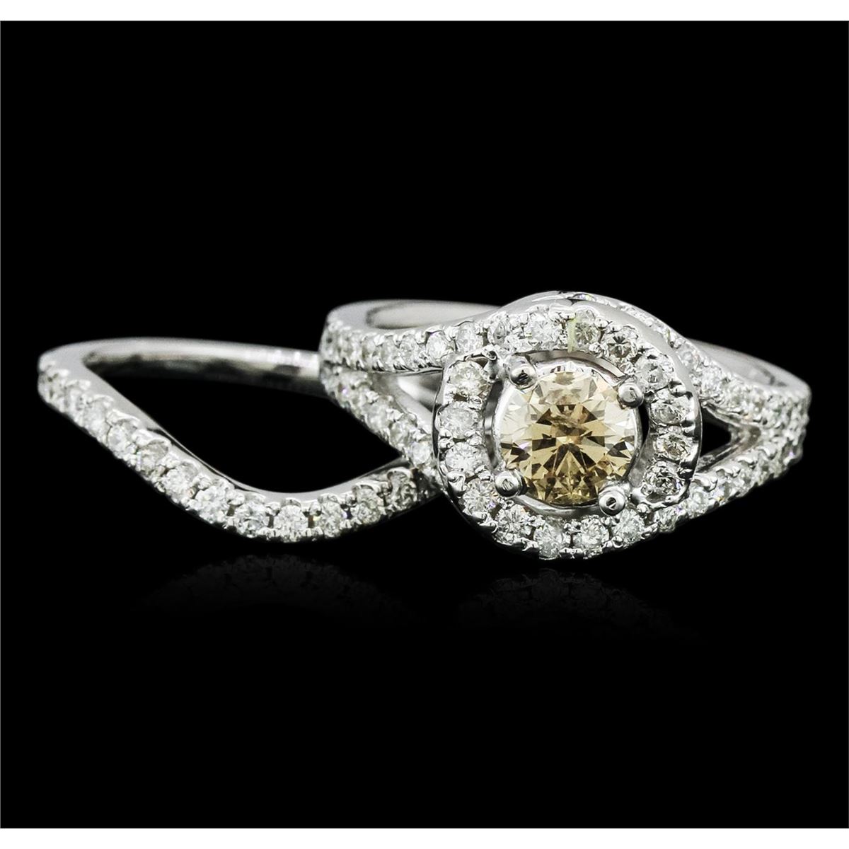 One electronically tested 14KT white gold ladies cast diamond engagement ring & guard set with a bright polish finish. Identified with markings of "14K". Condition is new. Containing: One prong set round brilliant cut diamond, measuring 5.50 - 5.50 x 3.30mm (depth est.) approximate weight of 0.61ct. Clarity: I-1. Colored gemstones are presumed to have been subjected to commonly used enhancement processes. All diamonds and colored gemstones are graded in the mounting, unless otherwise stated. Eighty prong set round brilliant cut diamonds, measuring 1.50 - 1.50 x 0.90mm (depth est.) approximate total weight of 80 Stones = 0.98ct. Clarity: SI-1 to I-1. Color: I - J. All diamonds are graded in the mounting, unless otherwise stated. Total Weight of Diamonds 1.59ct. Total Weight of Engagement Ring & Guard Set 8.40 grams. GGL Appraised at $6,665.00.