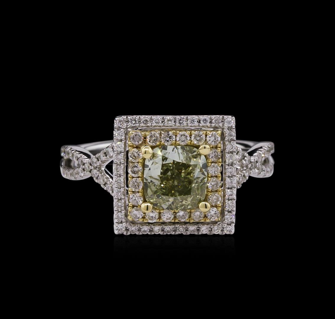 One electronically tested 14KT white gold ladies cast diamond unity ring. Condition is new, good workmanship. The featured diamond is set within two tiered diamond bezels supported by intertwining diamond set shoulders, completed by a one millimeter wide band. Bright polish finish with yellow gold accents. Identified with markings of "14K". Containing: One prong set cushion cut diamond, measuring 5.80 x 5.75 x 3.50mm (depth est.), 3.00% GTCF approximate weight of 1.20ct with a faint fluorescence. Graded in the setting. Clarity VS-1 Depth 60.9%Table 55.7% Ninety-Four prong set round brilliant cut diamonds, measuring 1.40 - 0.90 x 0.69mm (depth est.) approximate total weight of 94 Stones = 0.40ct. Graded in the setting. Clarity SI-1 to I-1 Color G - I Total Weight of Diamonds 1.60ct. Total Weight of Ring 3.33 grams. AIG Appraised at $12,360.00.