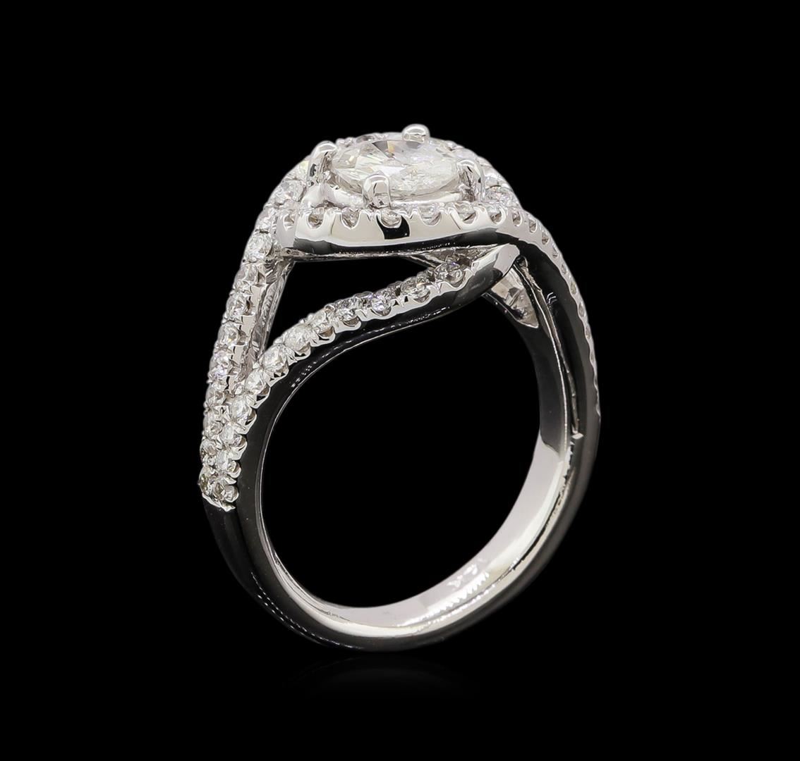 One electronically tested 14KT white gold ladies cast diamond engagement ring with a bright polish finish. Identified with markings of "14K". Condition is new. Containing: One prong set round brilliant cut diamond, measuring 6.50 - 6.40 x 3.30mm (depth est.) approximate weight of 0.84ct. Clarity: I-3. Color: J. Sixty-Two prong set round brilliant cut diamonds, measuring 1.50 - 1.50 x 0.90mm (depth est.) approximate total weight of 62 Stones = 0.76ct. Clarity: SI-2 to I-2. Color: H - I. All diamonds are graded in the mounting, unless otherwise stated. Total Weight of Diamonds 1.60ct. Total Weight of Engagement Ring 6.60 grams. GGL Appraised at $6,240.00.