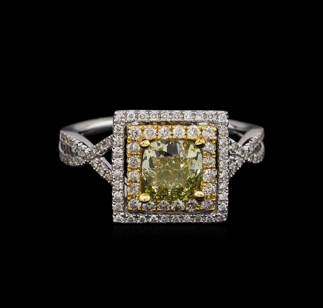 One electronically tested 14KT white gold ladies cast diamond unity ring. Condition is new, good workmanship. The featured diamond is set within two tiered diamond bezels supported by intertwining diamond set shoulders, completed by a one millimeter wide band. Bright polish finish with yellow gold accents. Identified with markings of "14K". Containing: One prong set cushion cut diamond, measuring 5.80 x 5.75 x 3.50mm (depth est.), 3.00% GTCF approximate weight of 1.20ct with a faint fluorescence. Graded in the setting. Clarity VS-1 Depth 60.9%Table 55.7% Ninety-Four prong set round brilliant cut diamonds, measuring 1.40 - 0.90 x 0.69mm (depth est.) approximate total weight of 94 Stones = 0.40ct. Graded in the setting. Clarity SI-1 to I-1 Color G - I Total Weight of Diamonds 1.60ct. Total Weight of Ring 3.33 grams. AIG Appraised.