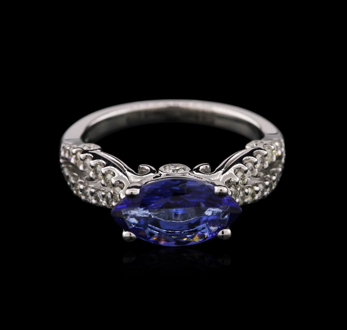 One electronically tested 14KT white gold ladies cast tanzanite and diamond ring with a bright polish finish. Identified with markings of "14K". Condition is new. Containing: One prong set marquise modified brilliant cut natural tanzanite, measuring 11.30 x 6.00 x 3.90mm, approximate weight of 1.60ct., clarity is eye clean, type I, medium light, very slightly grayish, violet color, (GIA V 4/3), cut is good. Thirty-Four prong set round brilliant cut diamonds, measuring 1.60 - 1.60 x 0.96mm (depth est.) approximate total weight of 34 Stones = 0.44ct. Clarity: I-1 to I-2. Color: I - J, Cut is Good. Colored gemstones are presumed to have been subjected to commonly used enhancement processes. All diamonds and colored gemstones are graded in the mounting, unless otherwise stated. Total Weight of Colored Stones 1.60ct. Total Weight of Diamonds 0.44ct. Total Weight of Ring 4.00 grams. GGL Appraised at $2,395.00.